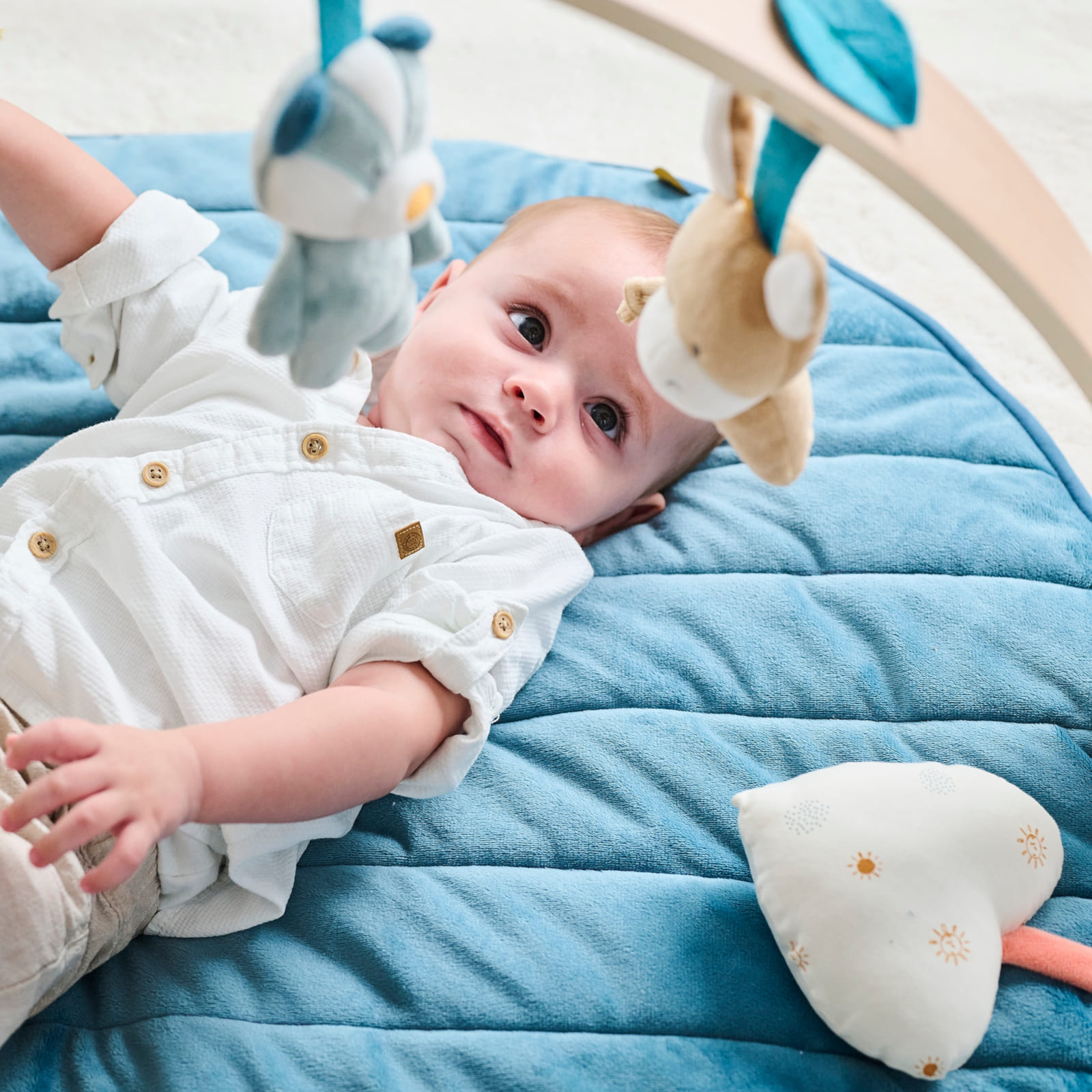 Der elegante Holzbogen ist funktional gestaltet und bringt mehrere Spielanreize direkt über der Matte an. Verschiedene Anhänger wie eine Rassel, ein kleiner Spiegel, ein Knistertier, ein Quietscher und ein Beissring laden zum Greifen, Fühlen und Entdecken ein.