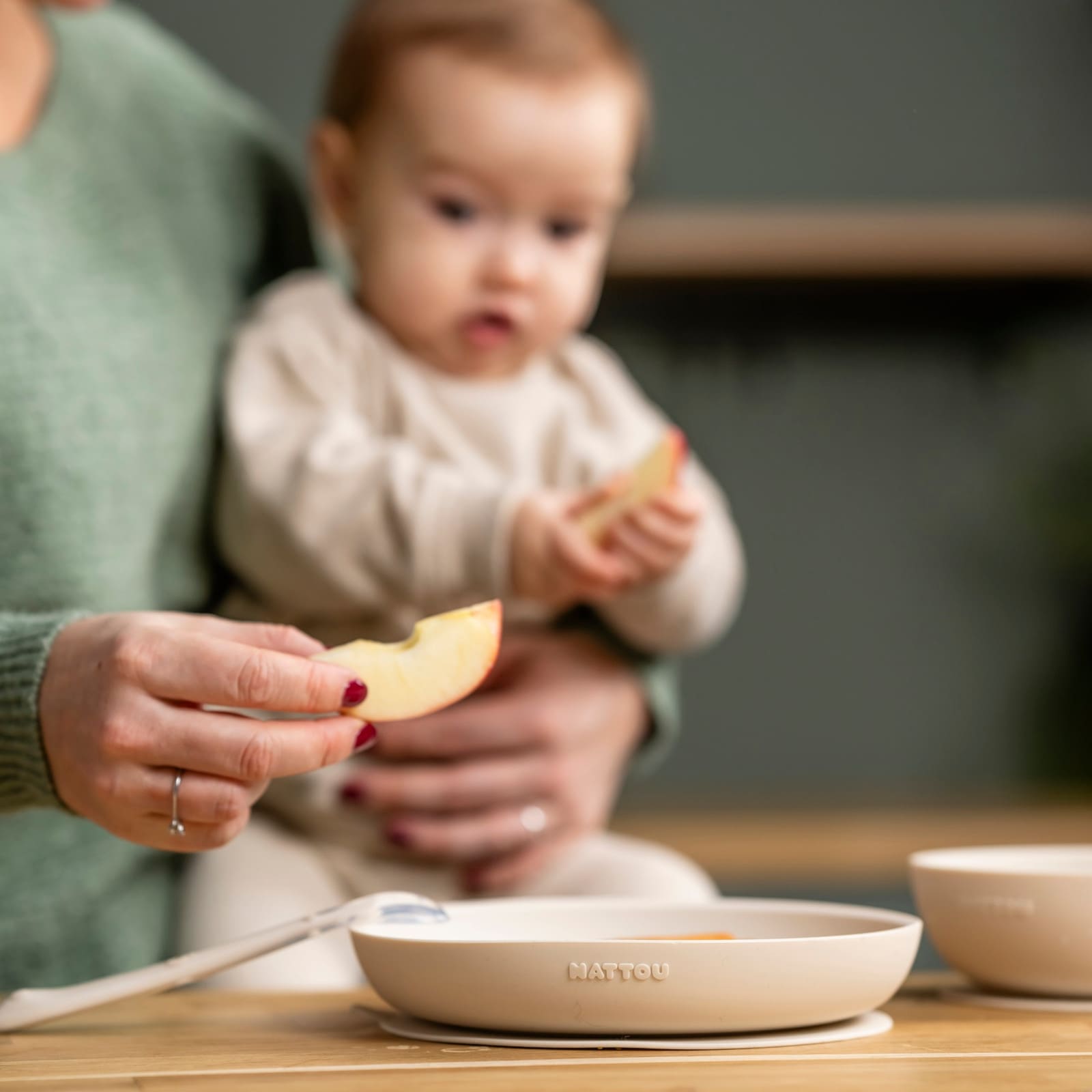 Das 3-teilige Set von NATTOU besteht aus hochwertigem, BPA-freiem Silikon, das weich in der Hand liegt und besonders schonend für Mund und Zahnfleisch ist. Die neutralen Beige-Töne schaffen eine ruhige Atmosphäre und lenken nicht vom Essenlernen ab.