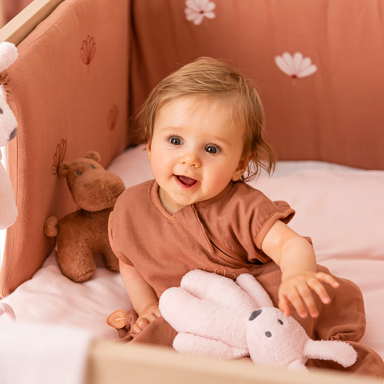 Bonnie der Hase aus der NATTOU Susie & Bonnie Serie präsentiert sich in zartem Rosa und ist aus besonders weichem Nicki-Material gefertigt. Das flauschige Fell lädt zum Kuscheln und Knautschen ein und fühlt sich sanft auf der Babyhaut an. Mit seiner handlichen Grösse liegt Bonnie gut in kleinen Händen und ist ein beruhigender Begleiter für die ersten Lebensmonate.