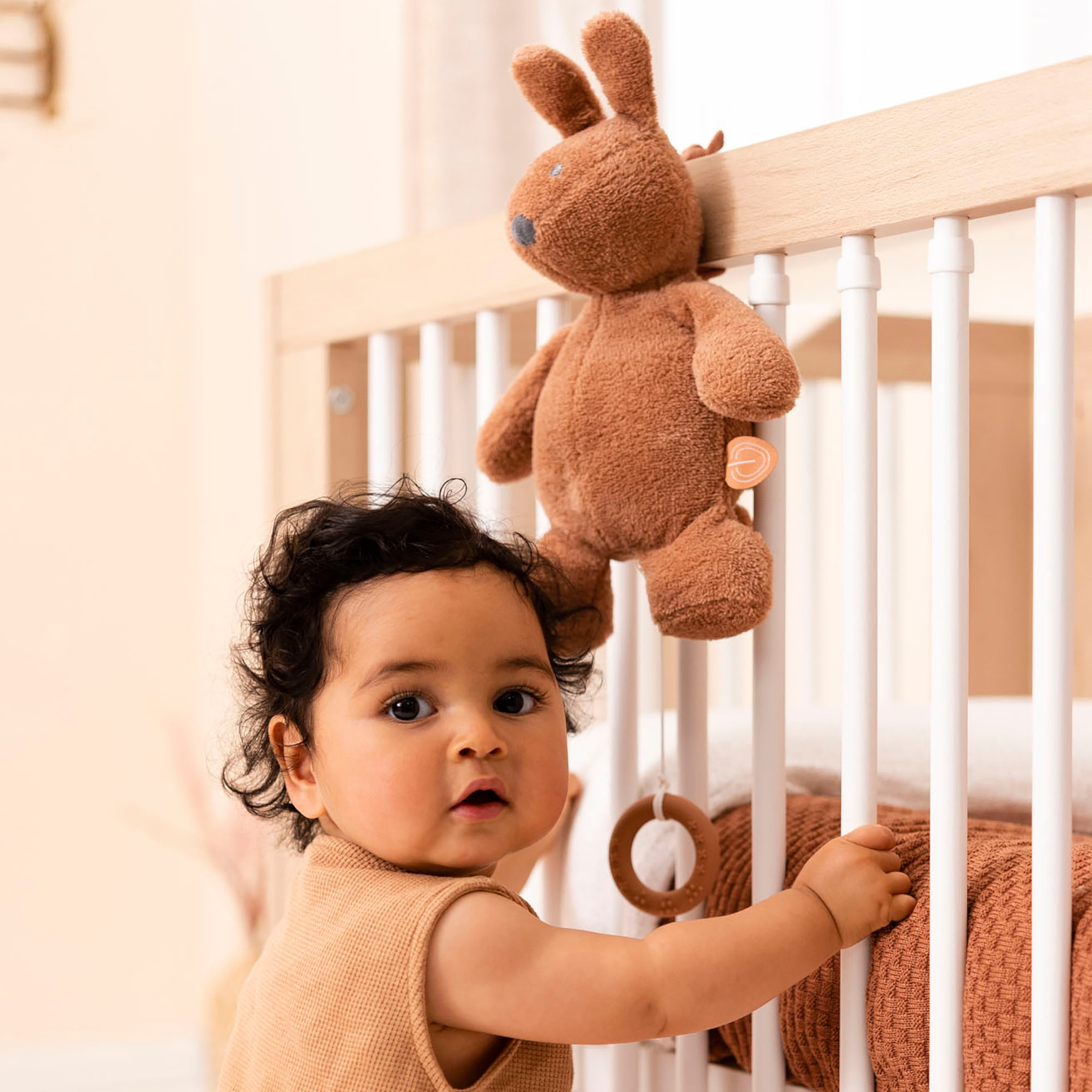 Gefertigt aus hochwertigen Materialien und mit sorgfältigen Nähten verarbeitet, entspricht die Spieluhr den gängigen Sicherheitsanforderungen für Babyspielzeug. So kannst du Bonnie bedenkenlos in die Hände deines Kindes geben.