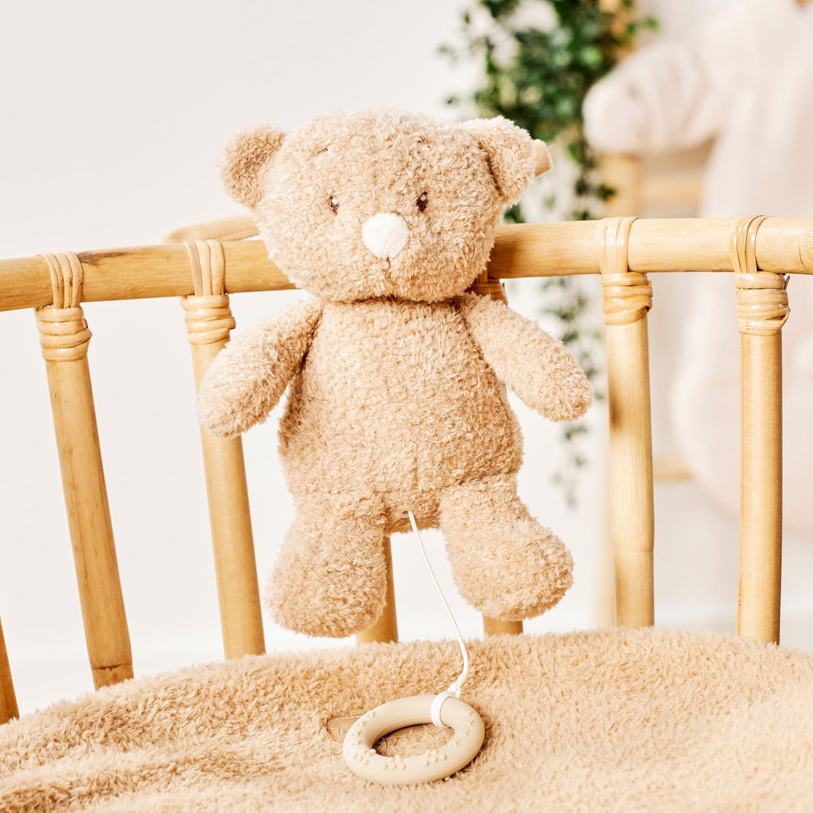 Die Baby-Spieluhr vereint Weichheit und Trost in einem spielerischen Begleiter. Mit niedlichem Ausdruck erobert sie mühelos die Herzen der Babys. Ziehst du am Silikonring, spielt die integrierte Spieluhr eine beruhigende Melodie. Ideal, um dein Kleines beim Einschlafen oder in unruhigen Momenten zu beruhigen. Dank der praktischen Bänder lässt sich das Musik-Stofftier einfach am Bett, der Wiege, dem Laufstall, Kinderwagen oder Autositz befestigen. Ein bezauberndes Accessoire und ein wundervolles Babygeschenk.