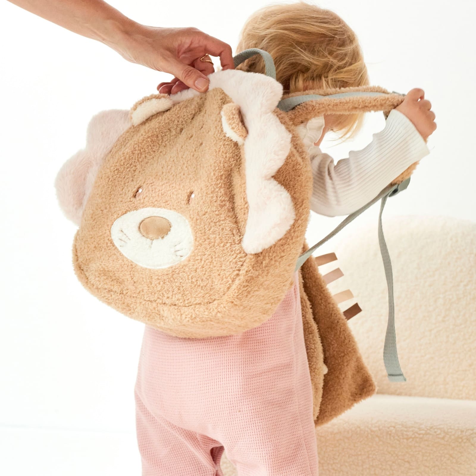 Der Rucksack zeigt ein liebevolles Löwenmotiv und ist speziell für Kleinkinder gestaltet. Weiche Stoffe sorgen für ein angenehmes Tragegefühl und lassen den Rucksack schnell zum Kuschelbegleiter werden.