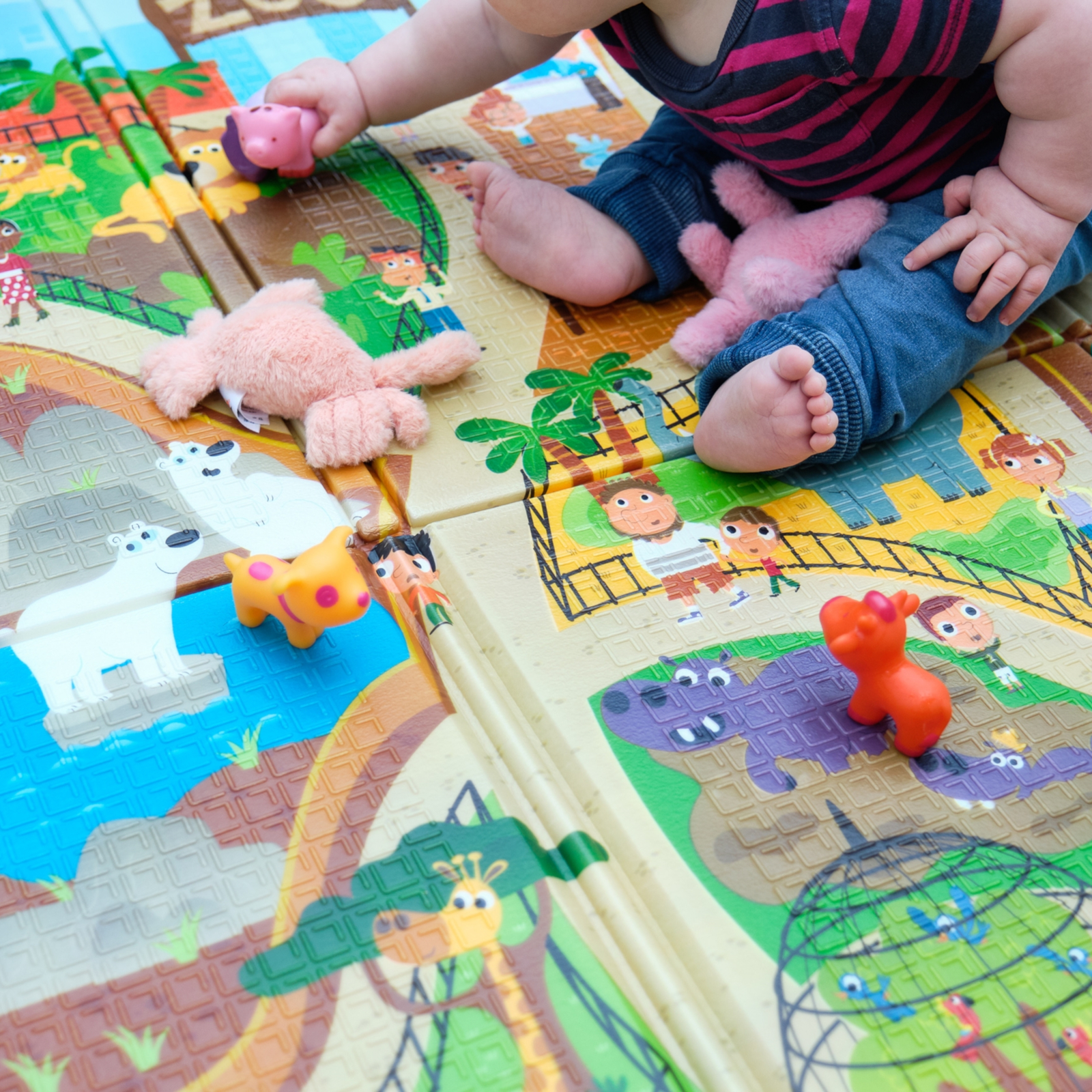 Diese doppelseitige Spielmatte bietet deinem Kind zwei liebevoll illustrierte Seiten zum Entdecken und Spielen. Die weiche, gepolsterte Oberfläche schützt beim Krabbeln und sorgt auch beim Sitzen für Komfort. Dank der faltbaren Konstruktion lässt sich die Matte platzsparend verstauen.