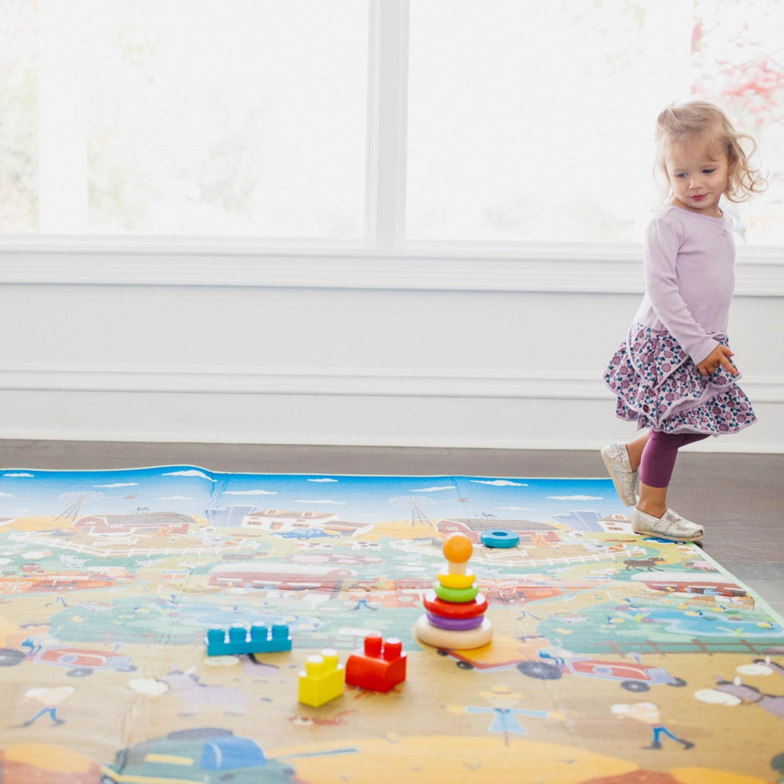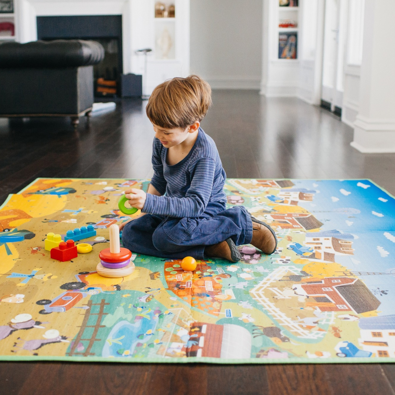 Mit zwei unterschiedlichen Motiven – City und Farm – wechselt die Spielumgebung im Handumdrehen. Jede Seite lädt zum Entdecken ein und regt die Fantasie mit liebevollen Details und Figuren an.