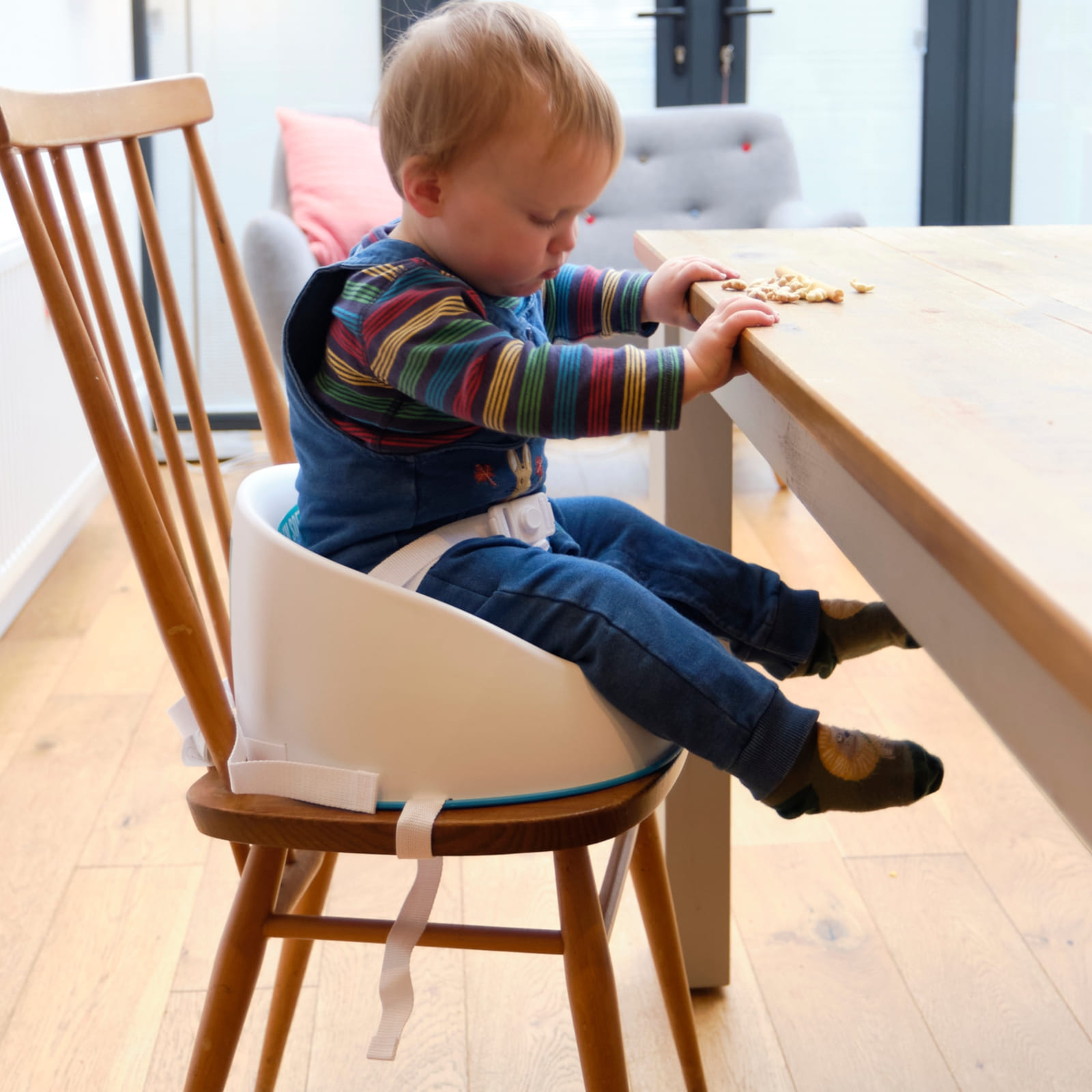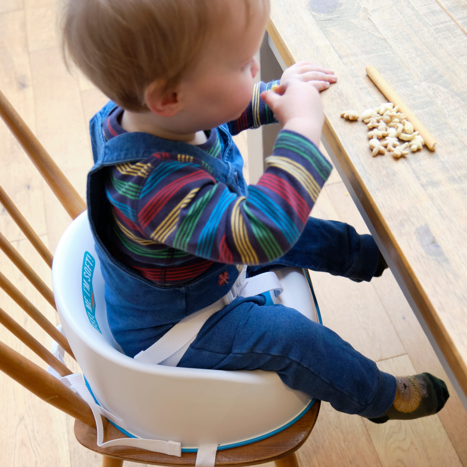 Dank des neutralen, fröhlichen Blautons passt der Booster in viele Einrichtungsstile und bietet eine praktische Lösung für Ess- und Spielzeiten – zuhause, bei Freunden oder auf Reisen.