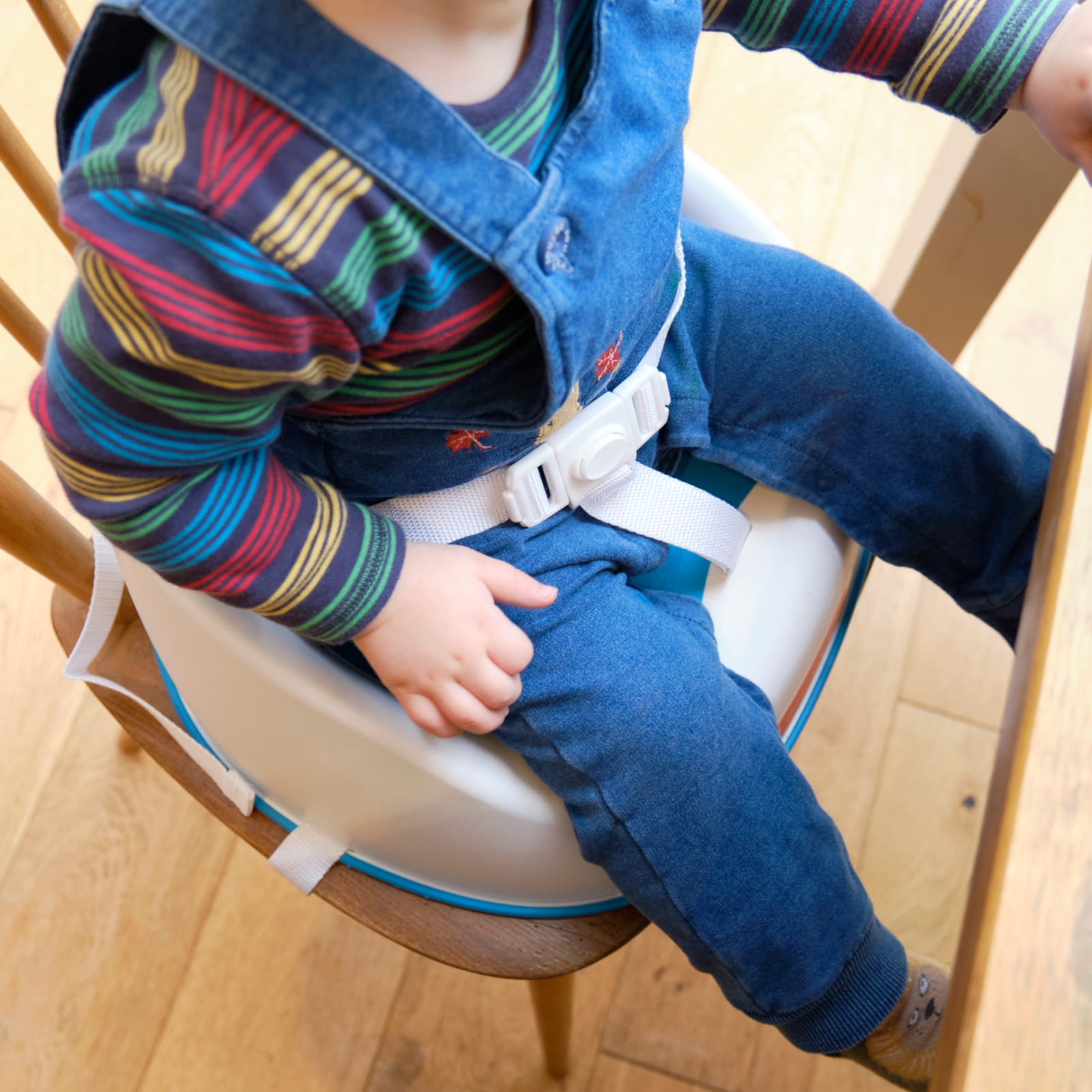 Der Booster ist mit drei Gurten ausgestattet: zwei zur Befestigung am Stuhl und ein Gurtsystem, das dein Kind sicher im Sitz hält. Diese mehrstufige Fixierung reduziert das Verrutschen und sorgt für eine stabile Sitzposition während der Mahlzeiten.