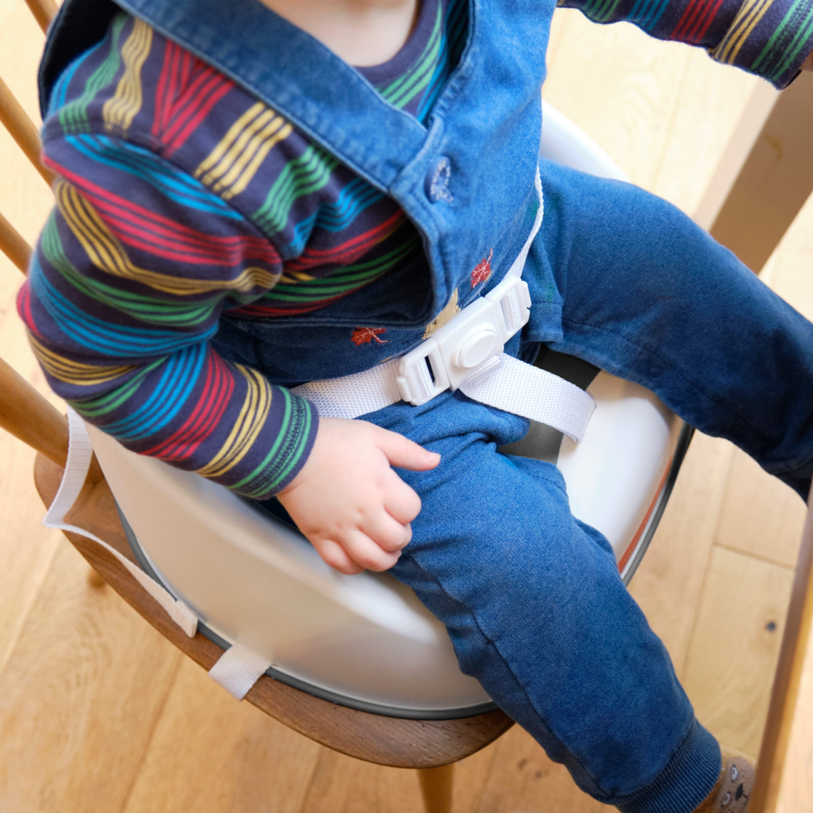 Der Booster ist mit drei verschiedenen Gurten ausgestattet: zwei Gurte zum Befestigen des Sitzerhohers am Stuhl und ein zusätzlicher Gurt, um dein Kind sicher im Sitz zu fixieren. So sitzt dein Kind stabil und geschützt, während ihr gemeinsam esst.