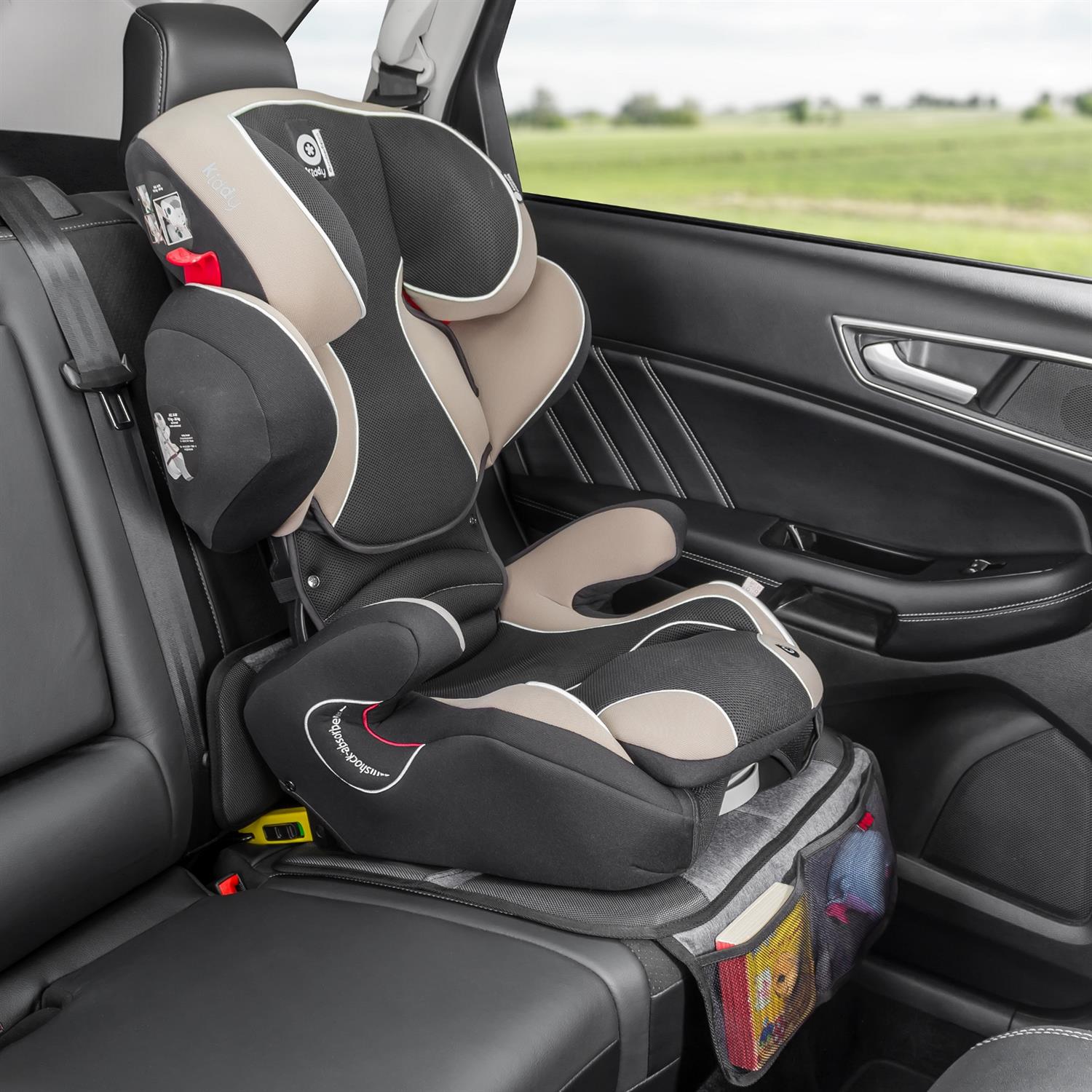 Integrierte Taschen bieten zusätzlichen Stauraum für Spielzeug, Flaschen oder kleine Accessoires und halten alles griffbereit. Diese Ordnungshilfen machen Ausflüge mit Kindern entspannter und sorgen für weniger Chaos im Auto.