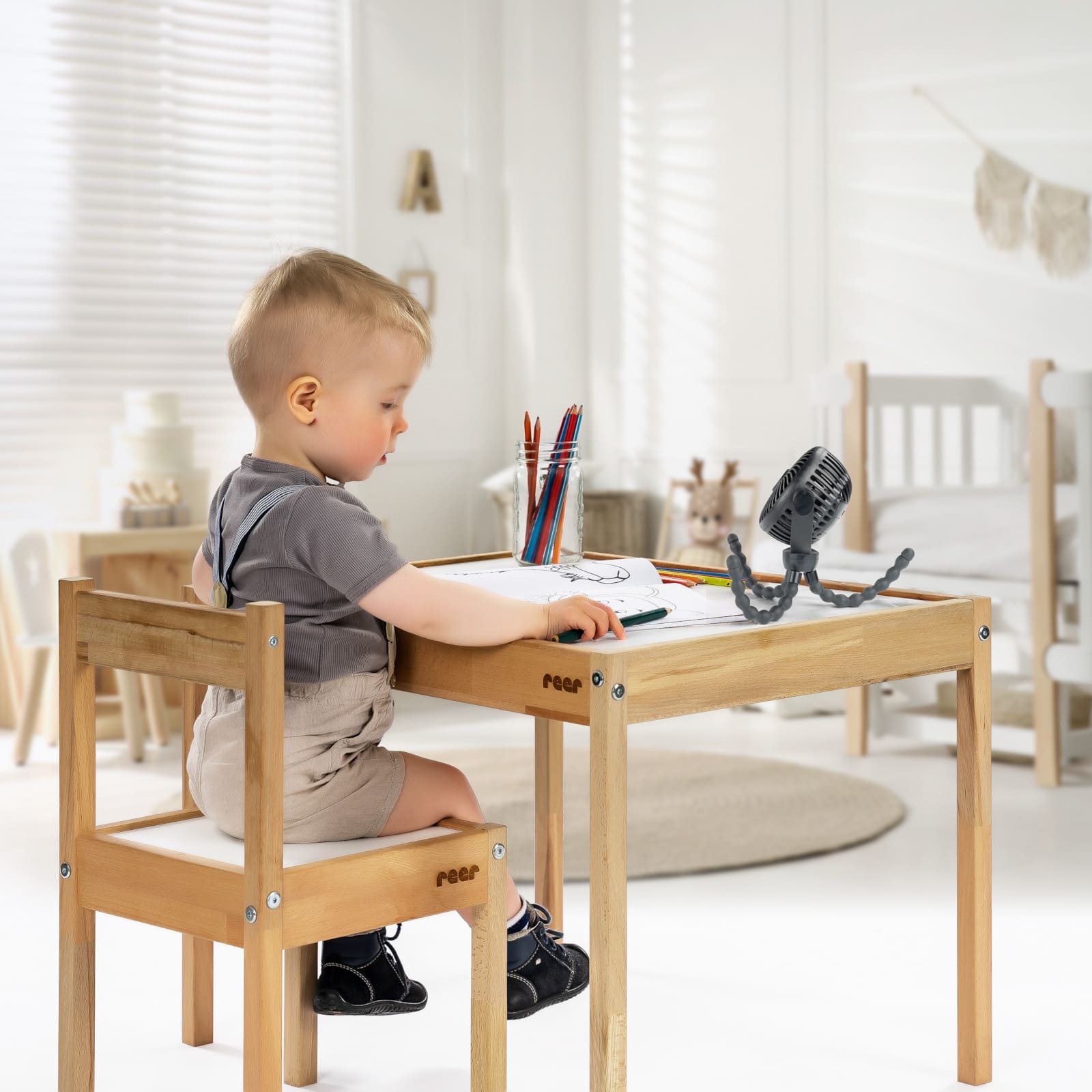 Der REER CoolAir Mini ist ein handlicher, akkubetriebener Ventilator, der sich ideal für den Alltag mit Babys und Kleinkindern eignet. Sein kompaktes Format macht ihn transportabel und unkompliziert in der Handhabung, sodass du jederzeit für angenehme Frische sorgen kannst.