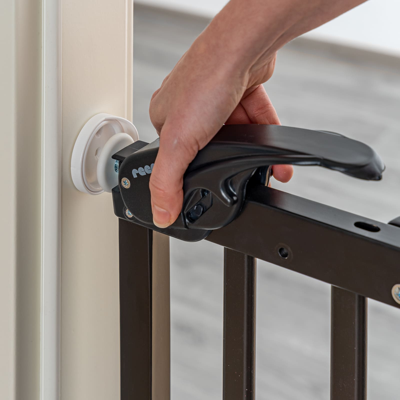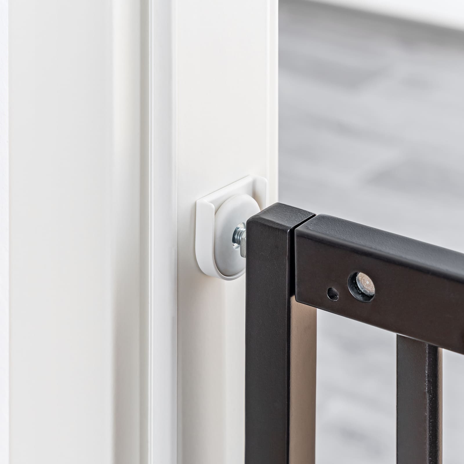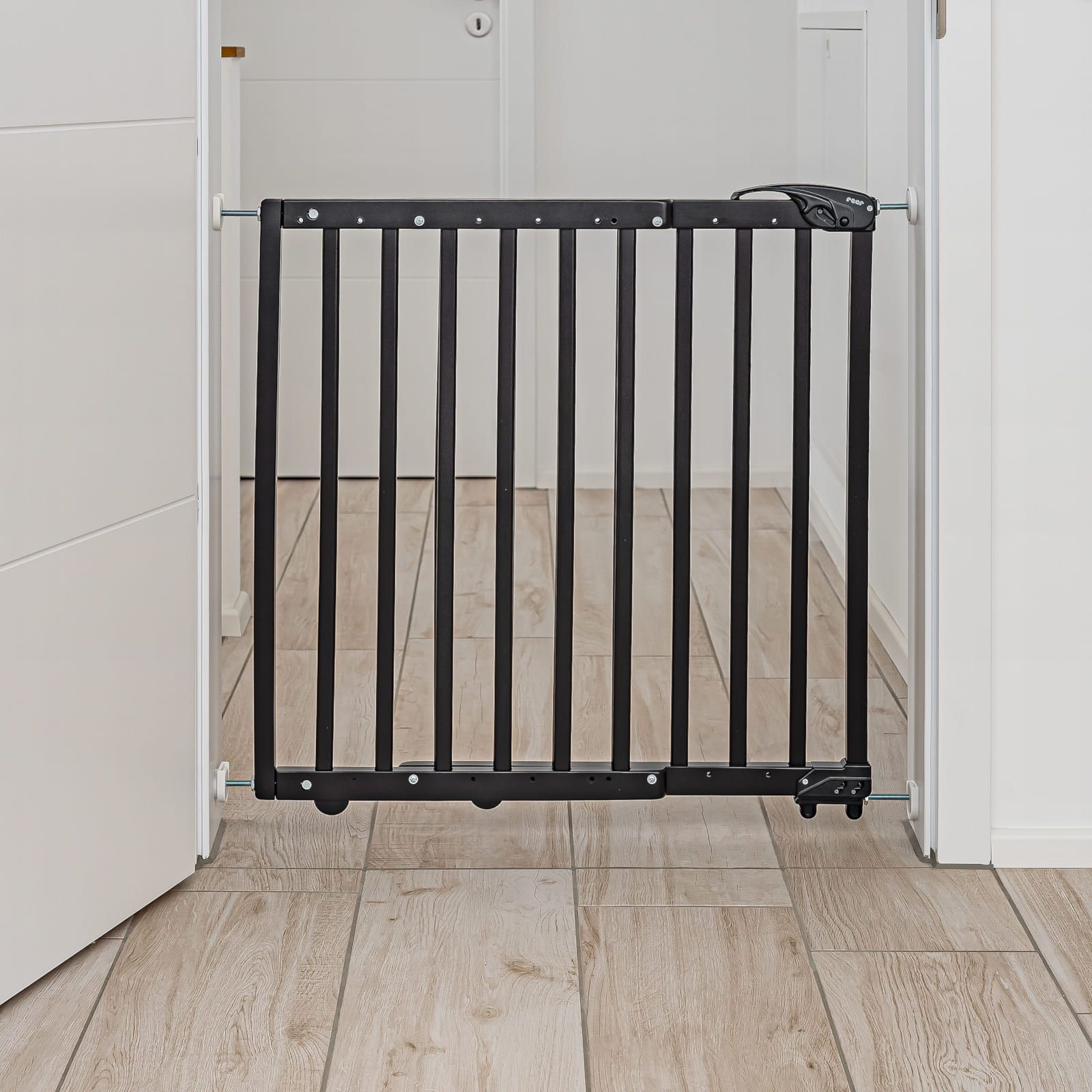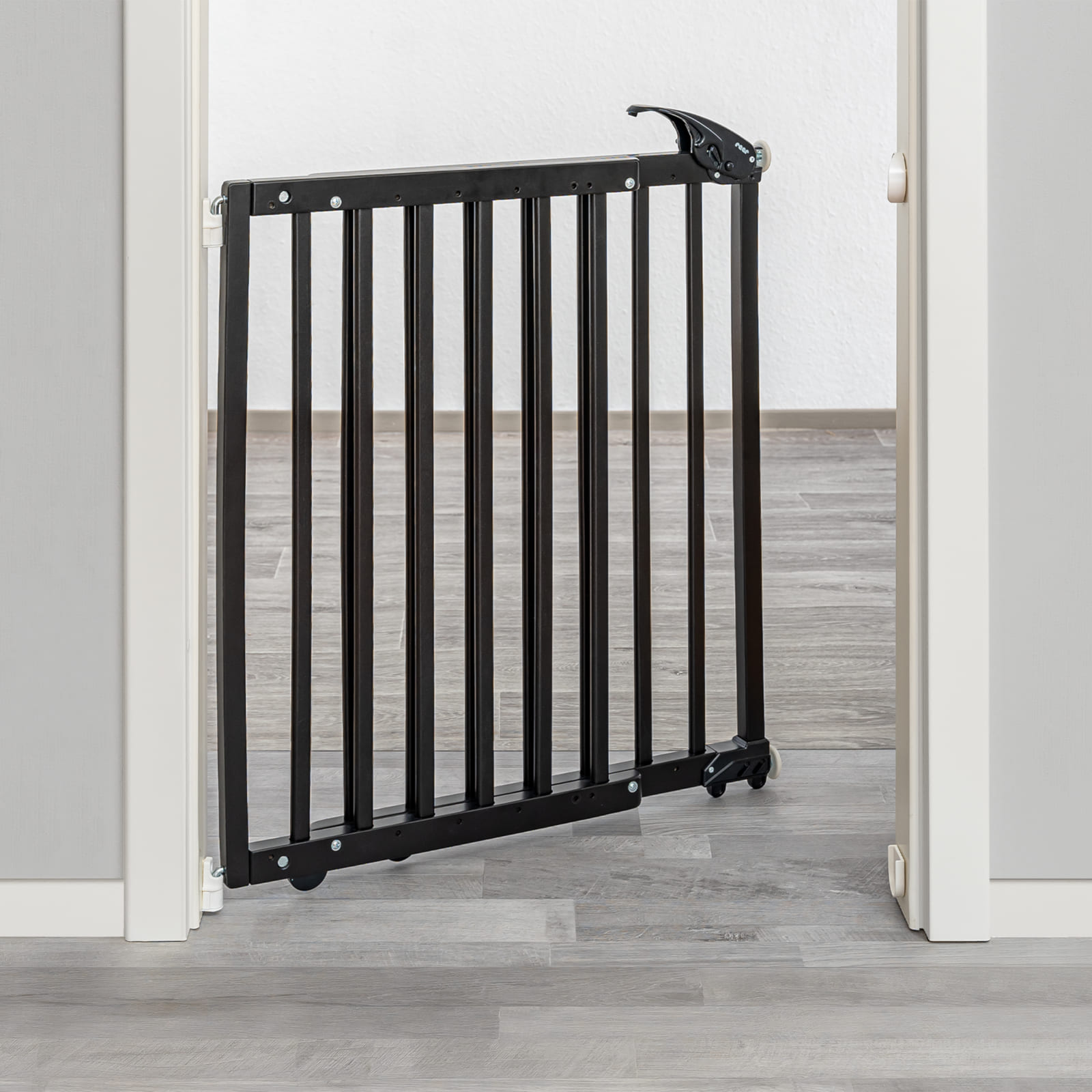 Die Breite ist stufenlos verstellbar von 63 bis 106 cm, so passt das Gitter in verschiedenste Tür- und Durchgangsbreiten. Diese Flexibilität sorgt für einen sicheren Sitz ohne ungewollte Lücken.