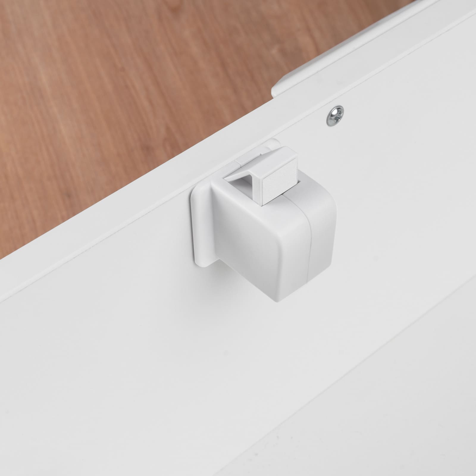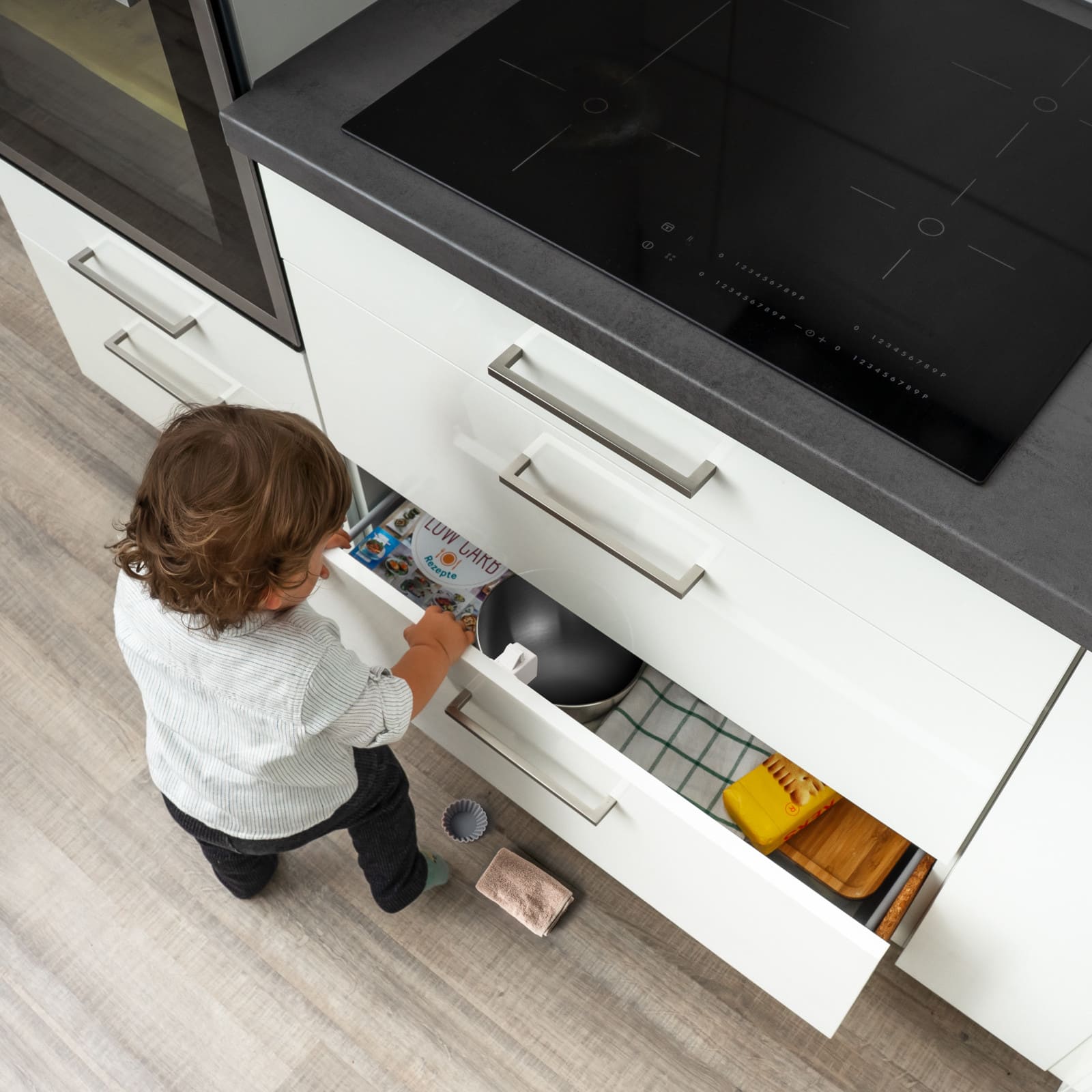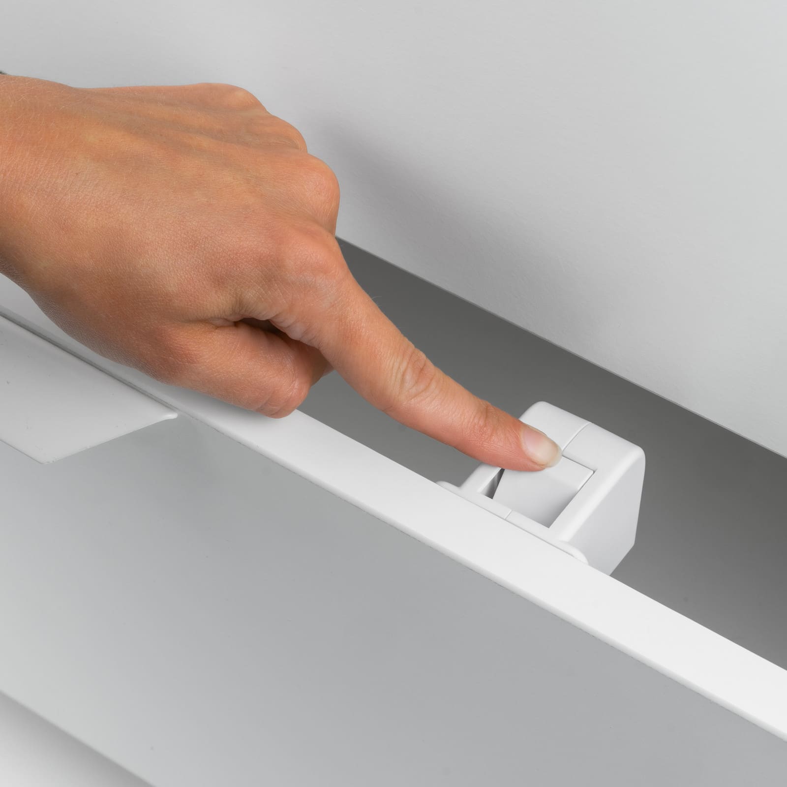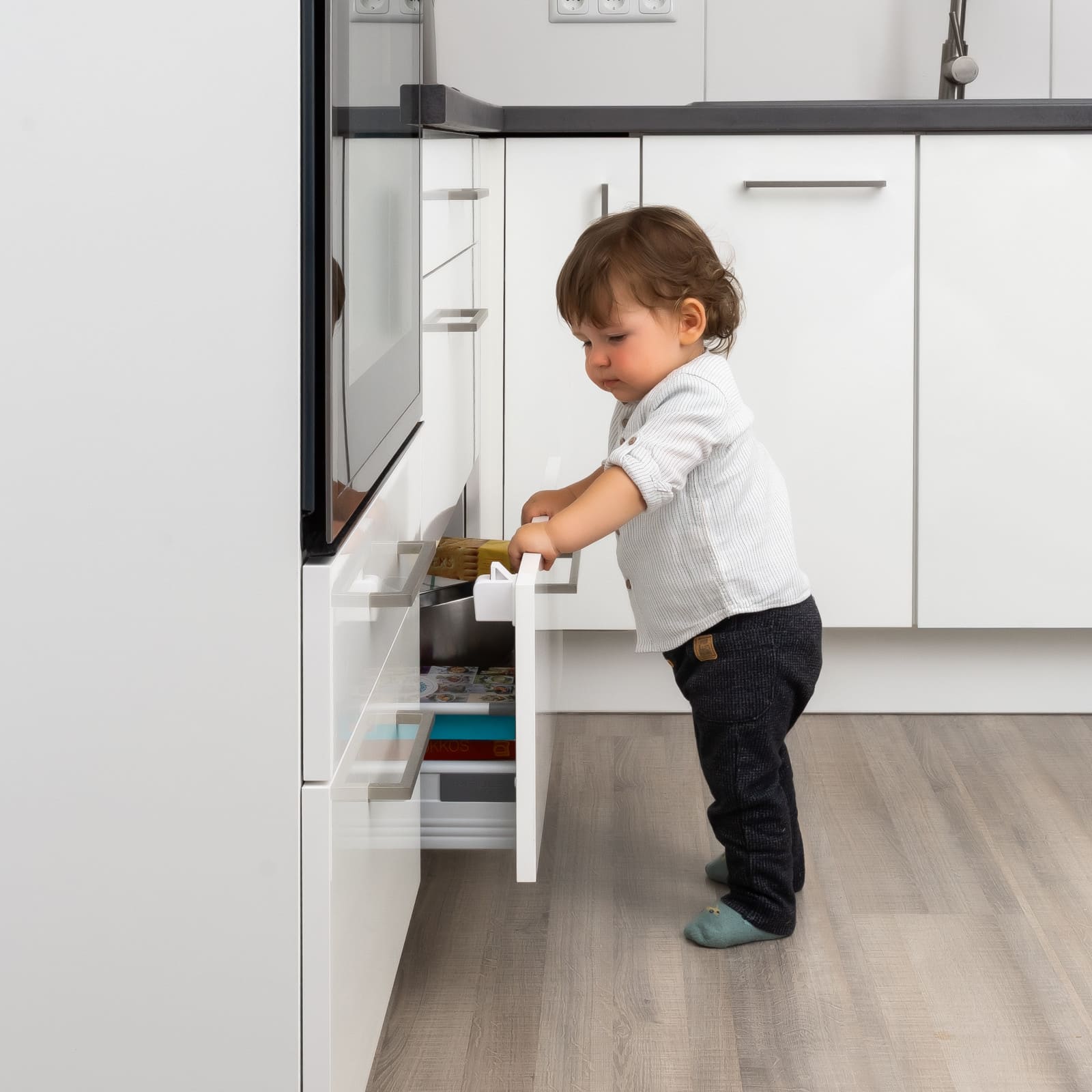 Die Schubladensicherung verhindert zuverlässig das Einklemmen von Fingern in Schubladen und ermöglicht es Kleinkindern, ihre Umgebung unbeschwert zu erkunden. Erwachsene können die Sicherung dank der einfachen Einhand-Bedienung mühelos öffnen und schliessen. Bei Nichtgebrauch lässt sie sich bequem deaktivieren, ohne Spuren zu hinterlassen. Die Montage erfolgt mittels Klebebefestigung im Inneren des Schranks und ist somit unauffällig und schnell erledigt.