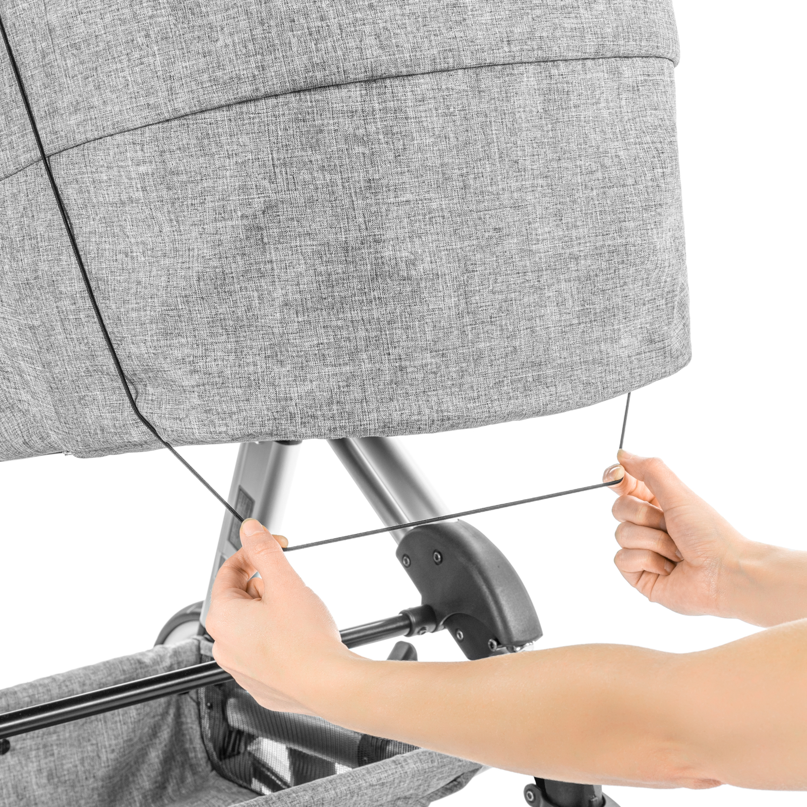 Die Montage ist unkompliziert: Die breite Seite wird über das Kinderwagenverdeck gelegt und mit dem Befestigungsgummi sicher um die Wanne gespannt. Anschliessend fixierst du die Bänder am Haltegriff, sodass das Segel stabil sitzt und auch bei Bewegung zuverlässig schützt.
