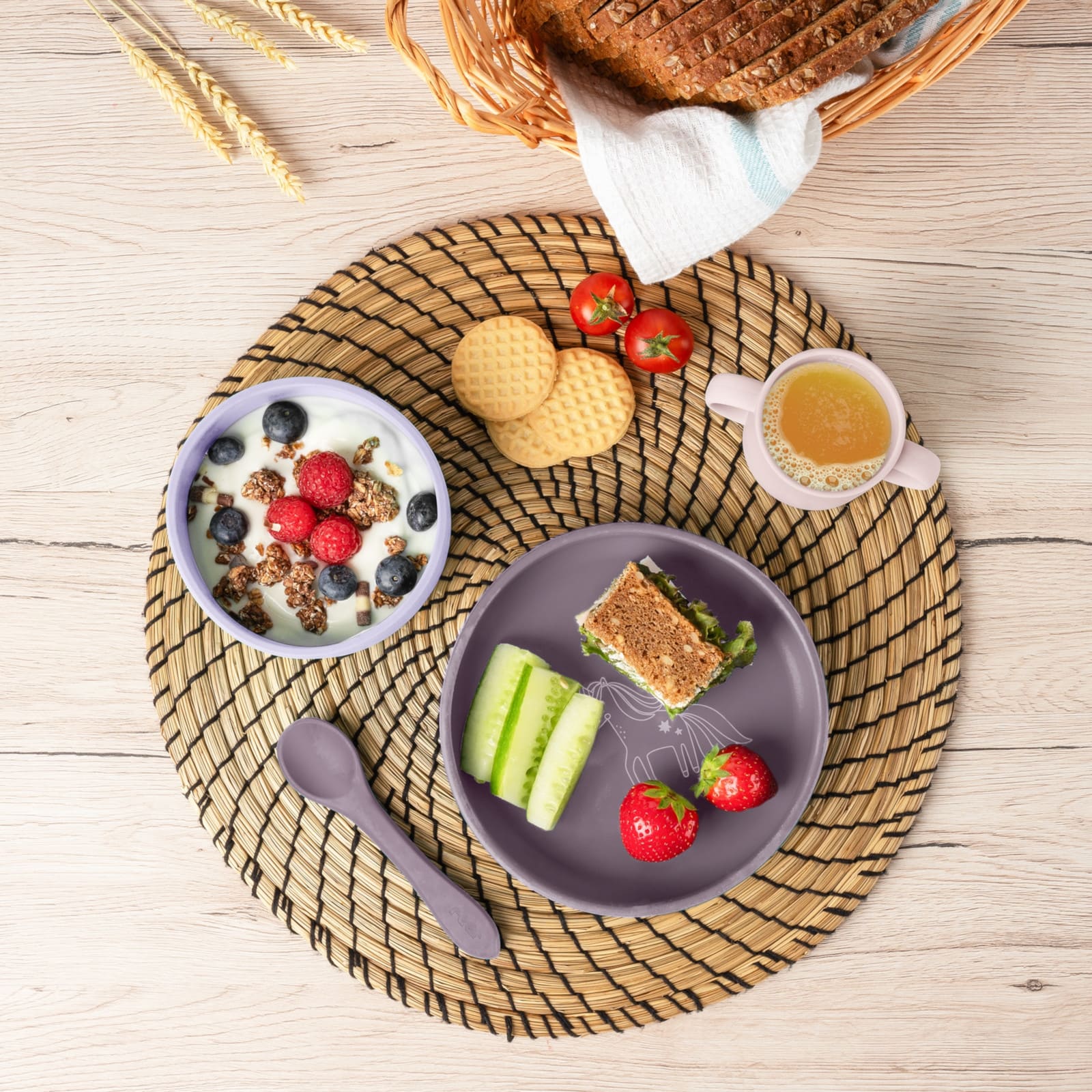 Das moderne, kindgerechte Design in attraktivem Lilaton bringt Farbe an den Tisch und spricht sowohl Kinder als auch Eltern an. Abgerundete Kanten und ergonomische Formen erleichtern das Greifen und Fördern der Selbstständigkeit beim Essen.