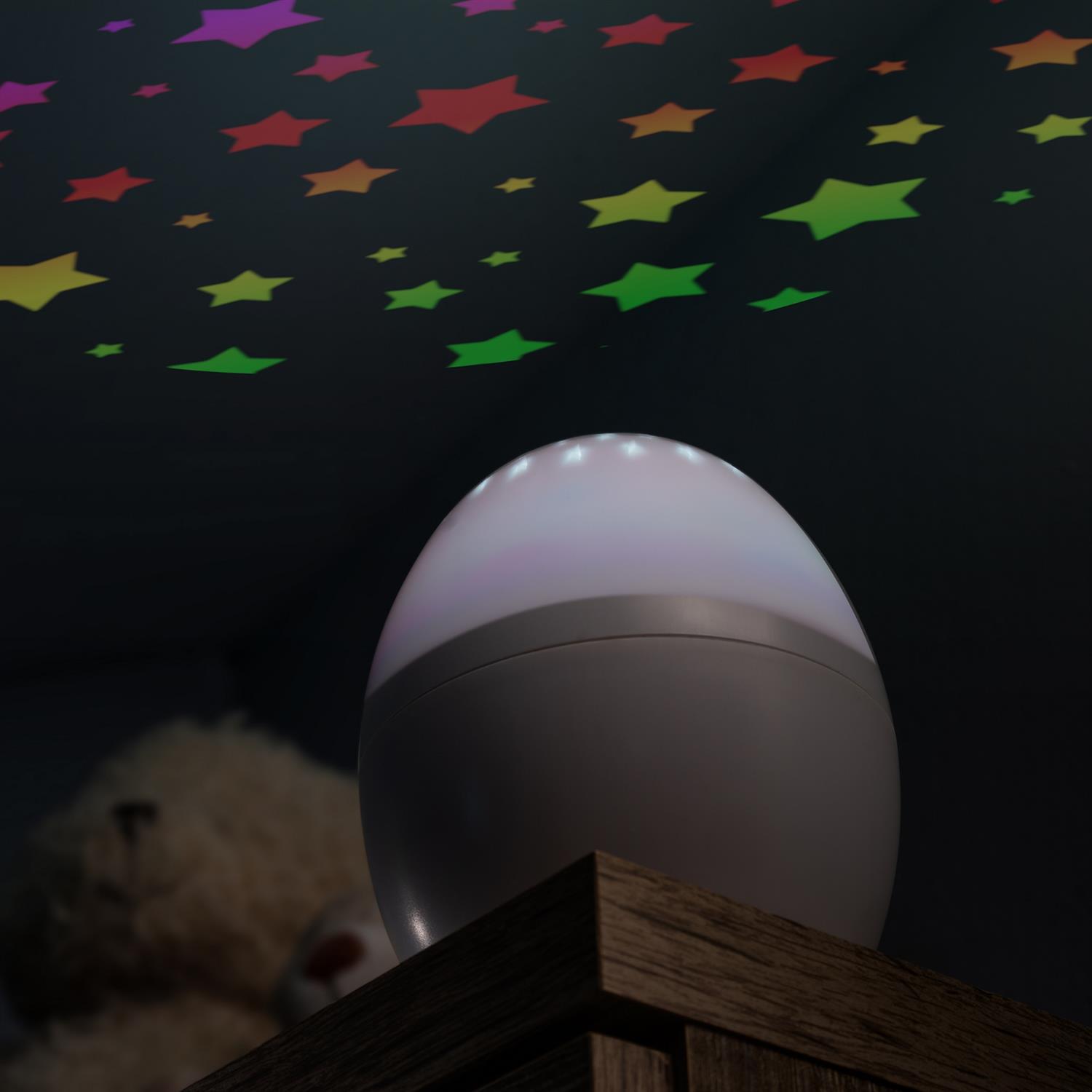 Ein integrierter Weisslicht-Modus kombiniert warmweisses Schlummerlicht mit der bunten Projektion, sodass du je nach Stimmung zwischen reinem Sternenhimmel und einer sanften Grundbeleuchtung wählen kannst.