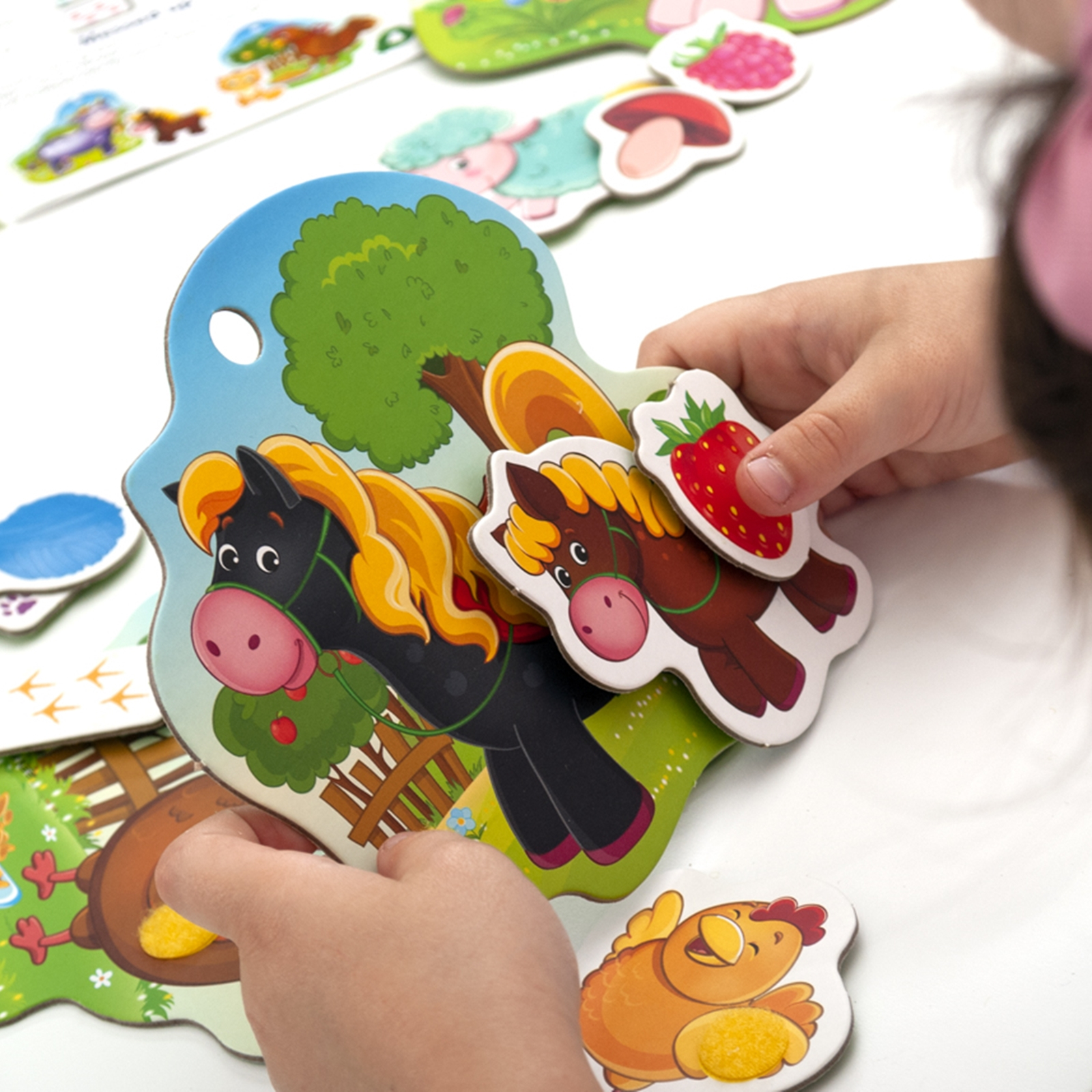 Das Lernspiel zeigt liebevoll gestaltete Bauernhoftiere und ihre Jungen, die per Klettverschluss an den passenden Elternteil befestigt werden. Die einzelnen Teile sind kindgerecht geformt und laden zum freien Spielen und Zuordnen ein. So lernen Kinder auf spielerische Weise Tiernamen, Aussehen und den Zusammenhang zwischen Mama und Baby.