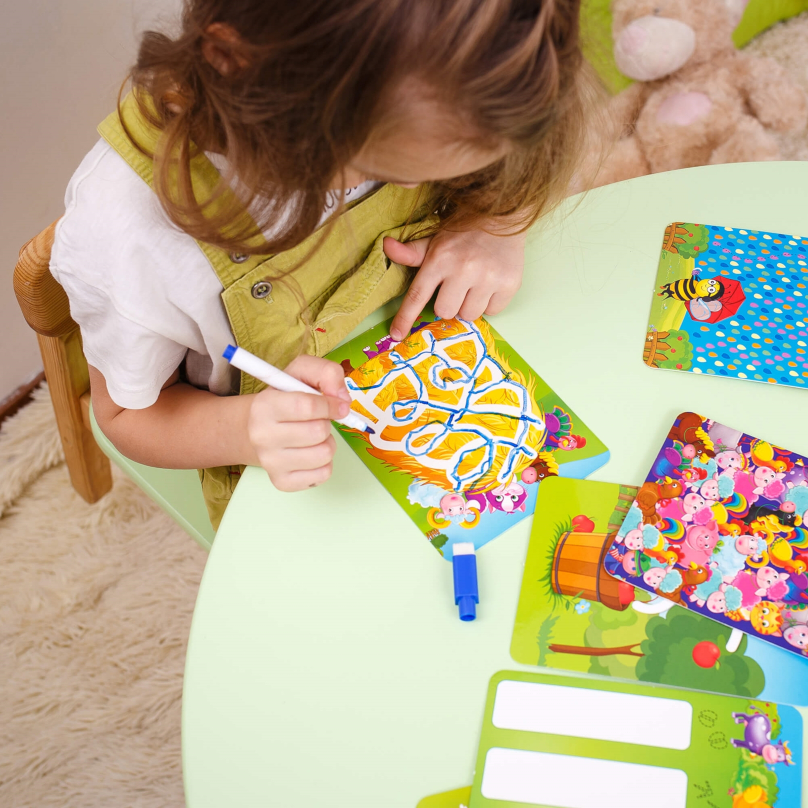 Feinmotorische Fähigkeiten werden gestärkt, weil das präzise Halten und Führen des Stifts die Hand-Augen-Koordination fördert. Gleichzeitig unterstützen die Bildmotive die sprachliche Entwicklung und erweitern den Wortschatz beim gemeinsamen Entdecken.