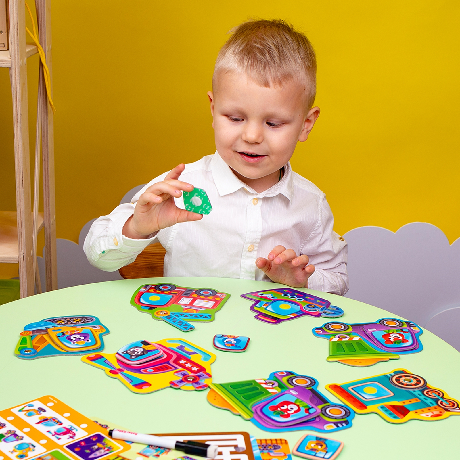 Im Set sind sechs Spielbasen und sechs zugehörige Spielfiguren enthalten, die per Klettverschluss sicher befestigt werden können. Zusätzlich gibt es sechs Aufgabenkarten sowie einen abwischbaren Stift, so dass die Aufgaben mehrfach gelöst und neu gestellt werden können.