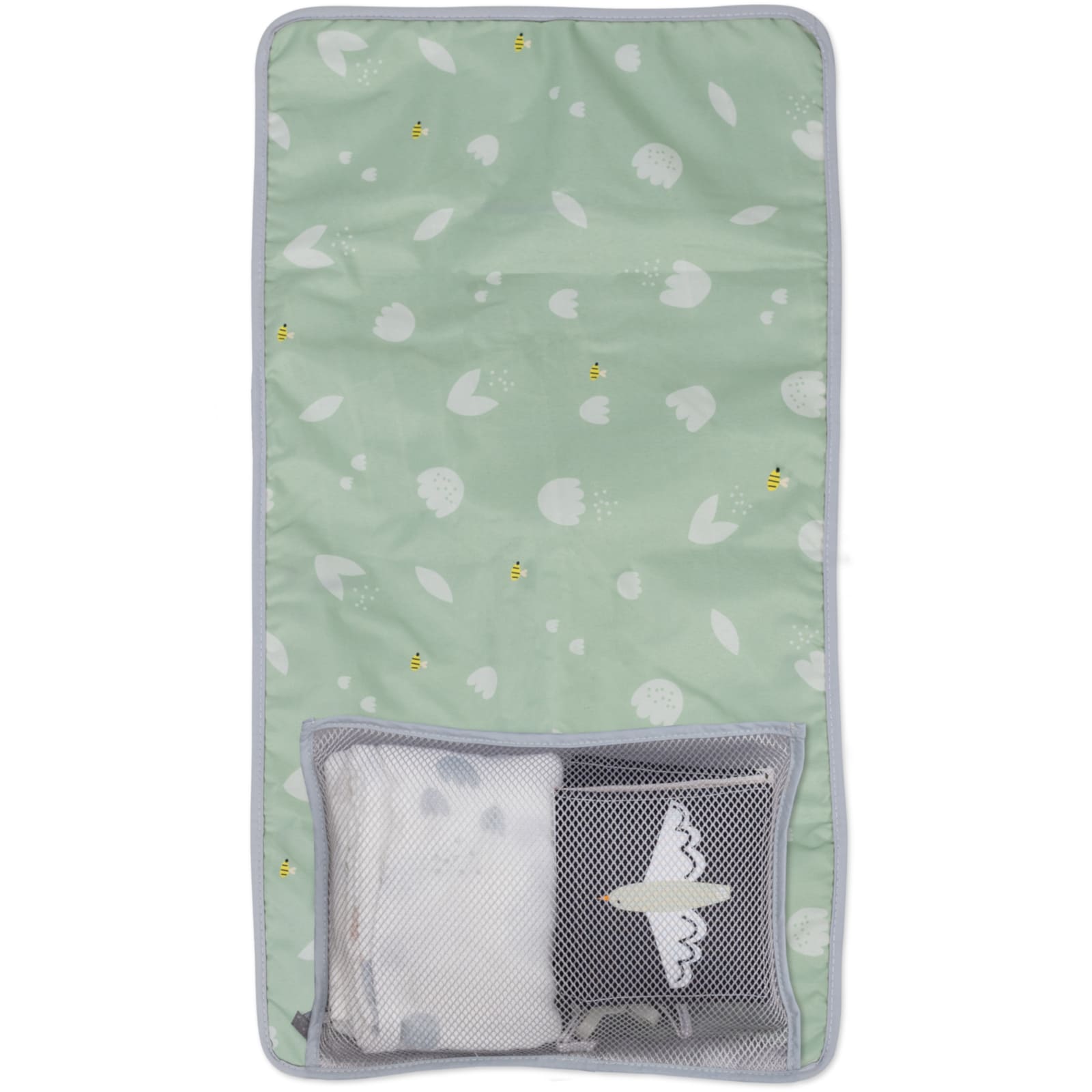 Das Schmusetuch ist besonders weich und sanft zur zarten Babyhaut; es dient neben dem Kuscheln auch als kleiner Schutz vor Wind oder Sonne. Die Wickelunterlage lässt sich kompakt zusammenfalten und bietet unterwegs eine saubere, gepolsterte Fläche zum Wickeln.