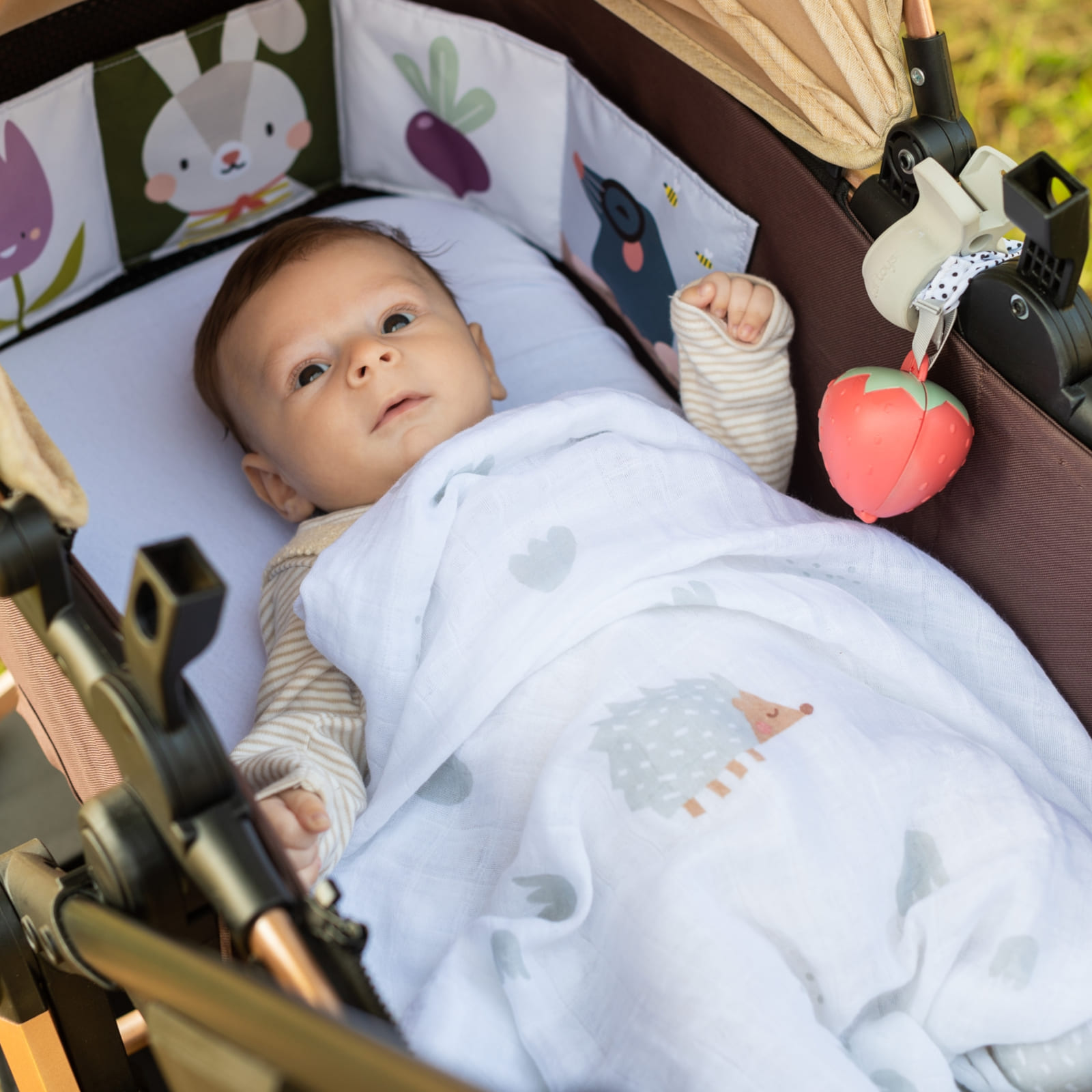 Das Paket enthält ein grosses Schmusetuch, eine faltbare Wickelunterlage, zwei praktische Plastikclips, eine Rassel, ein doppelseitiges Babybuch sowie eine hygienische Schnullerbox in Erdbeerform. Jedes Teil ist durchdacht aufeinander abgestimmt und eignet sich ideal für die Wickeltasche oder den Kinderwagen.