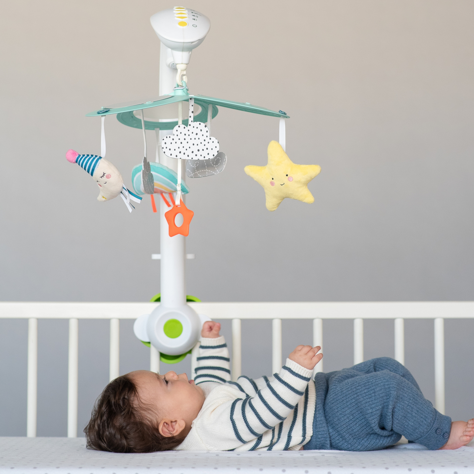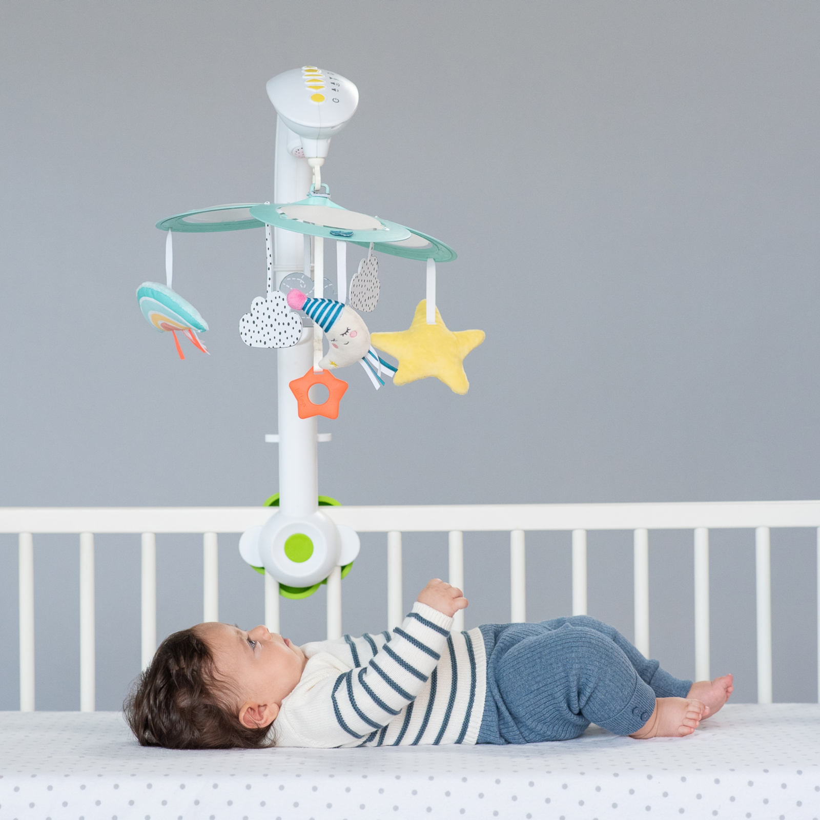 Neben seiner Rolle als Einschlafhilfe begleitet das Mobile dein Baby spielerisch bei ersten Entdeckungen und trägt so zur frühkindlichen Entwicklung bei.