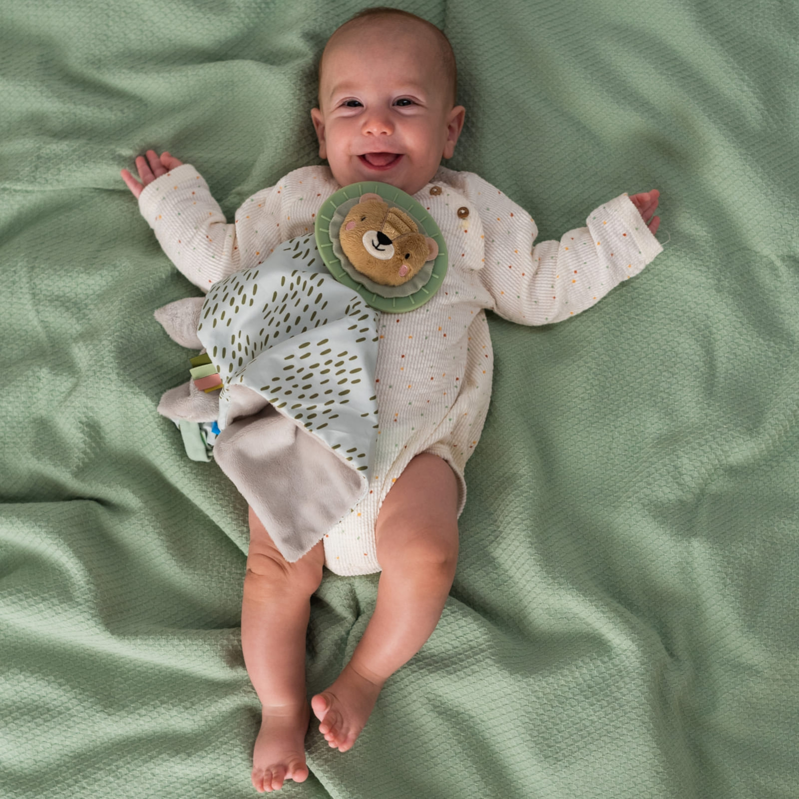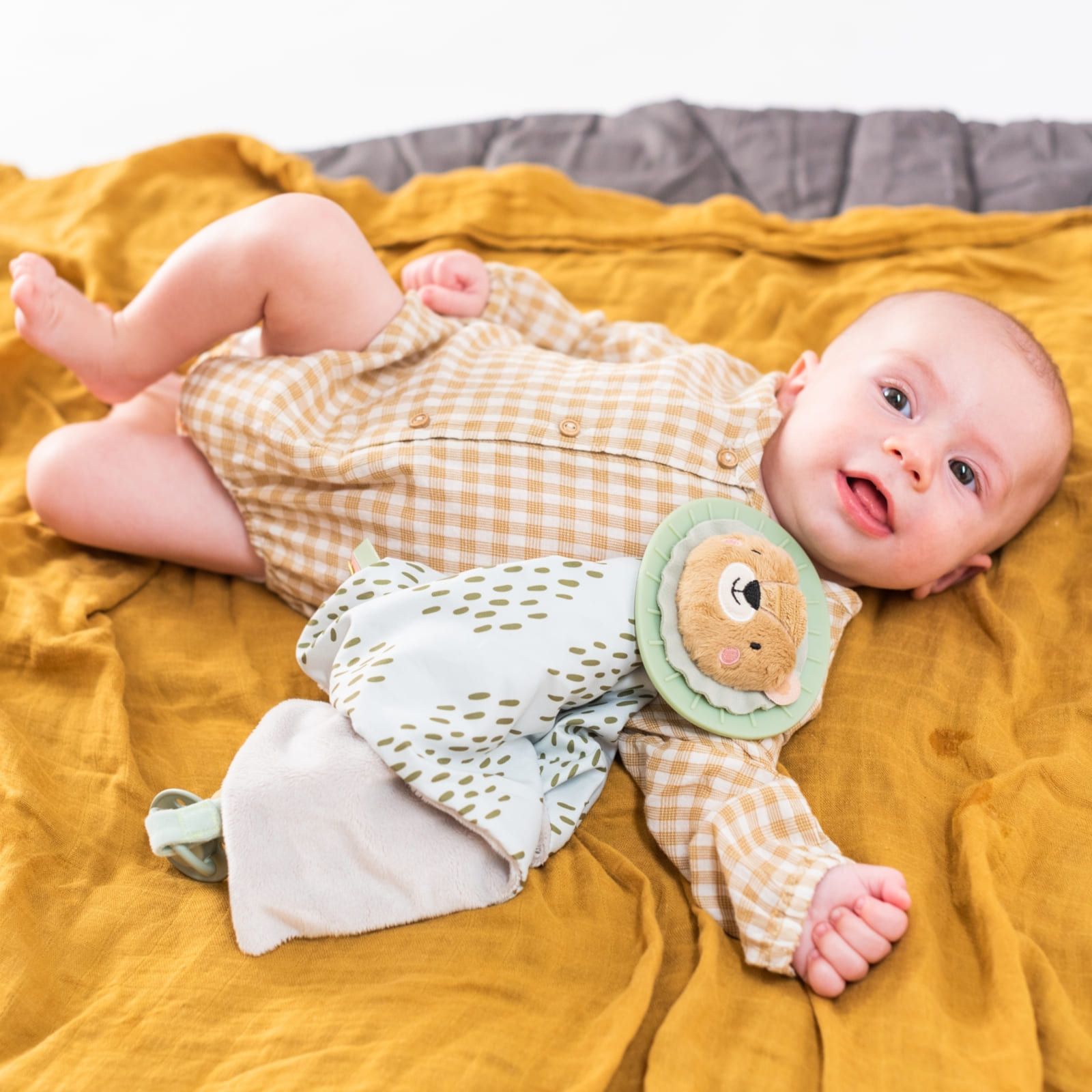 In das Kuscheltuch ist eine Zahnungshilfe integriert, die deinem Baby beim Zahnen Linderung verschafft. Die strukturierte Oberfläche bietet sicheren Halt und beruhigt beim Beißen.
