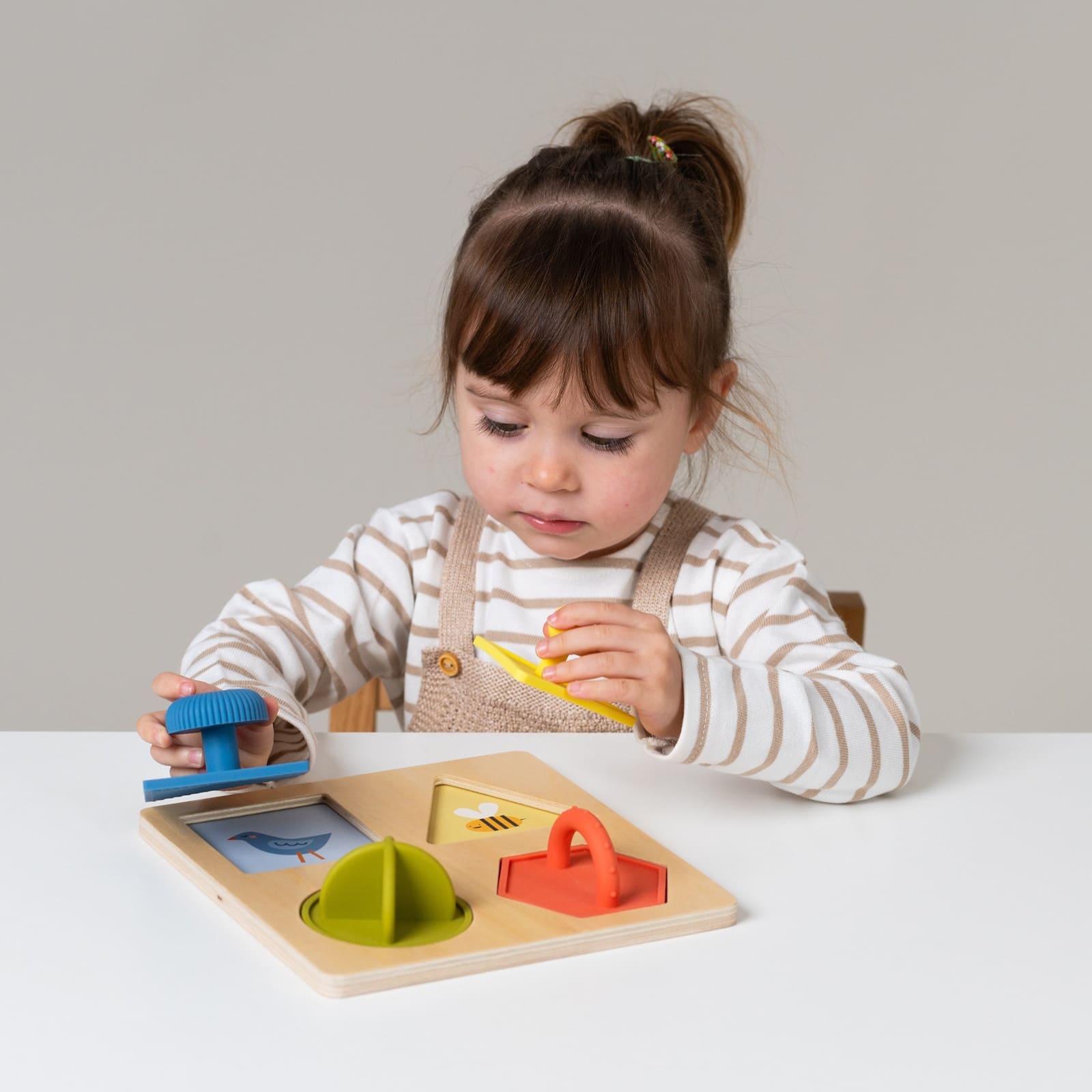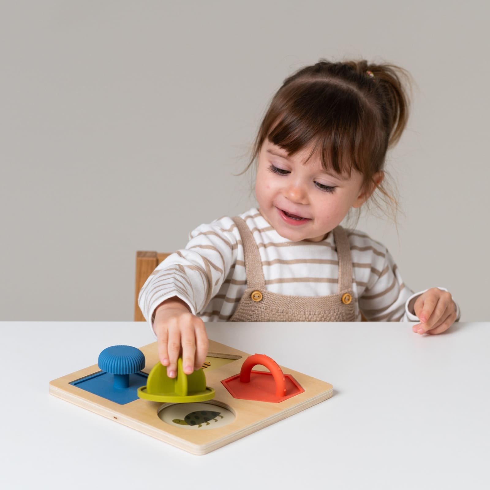 Das gezielte Greifen, Einsetzen und Herausnehmen der Teile stärkt die Fingerfertigkeit und trainiert die Hand-Augen-Koordination. Diese Grundfähigkeiten sind wichtiger Baustein für spätere Tätigkeiten wie Schreiben oder Basteln.