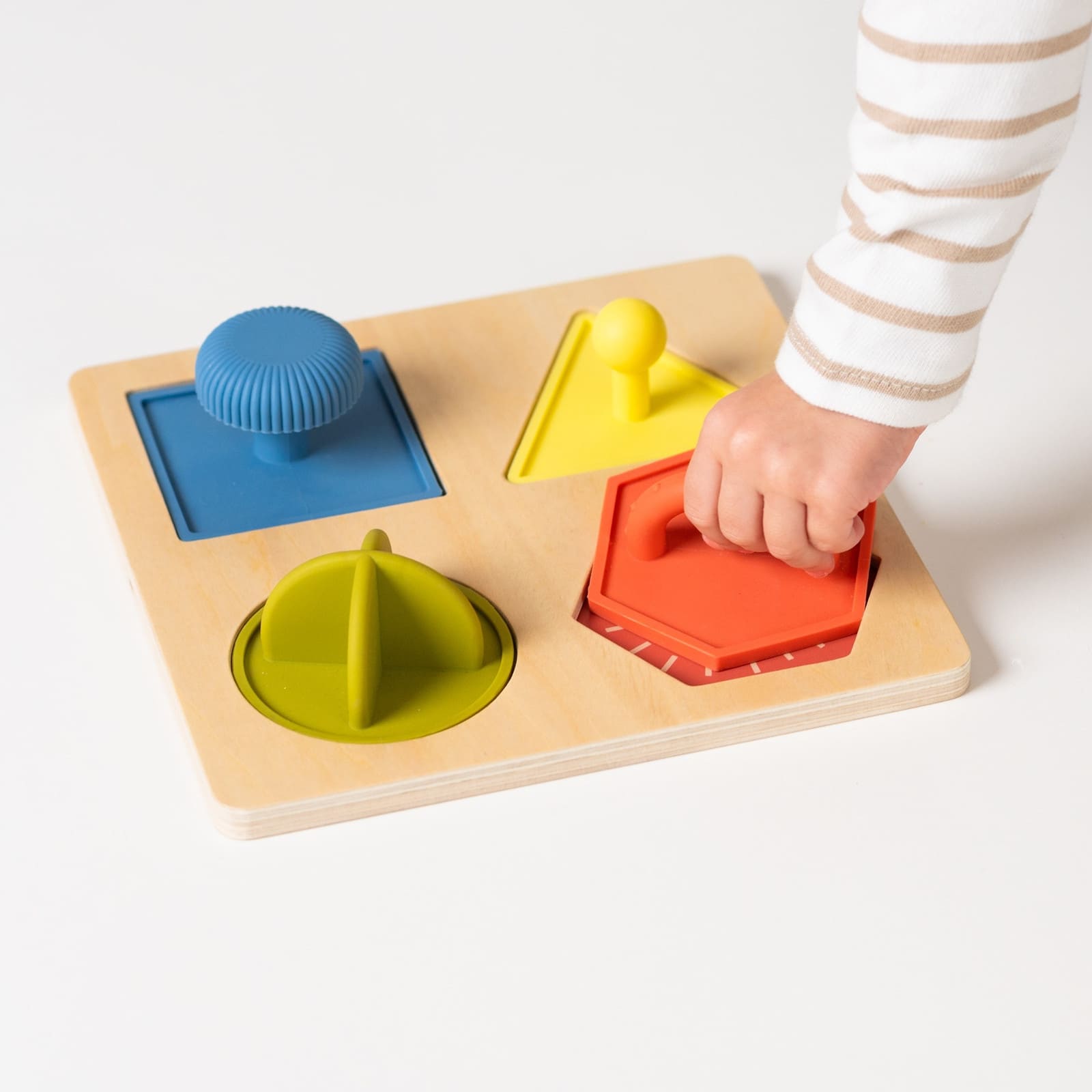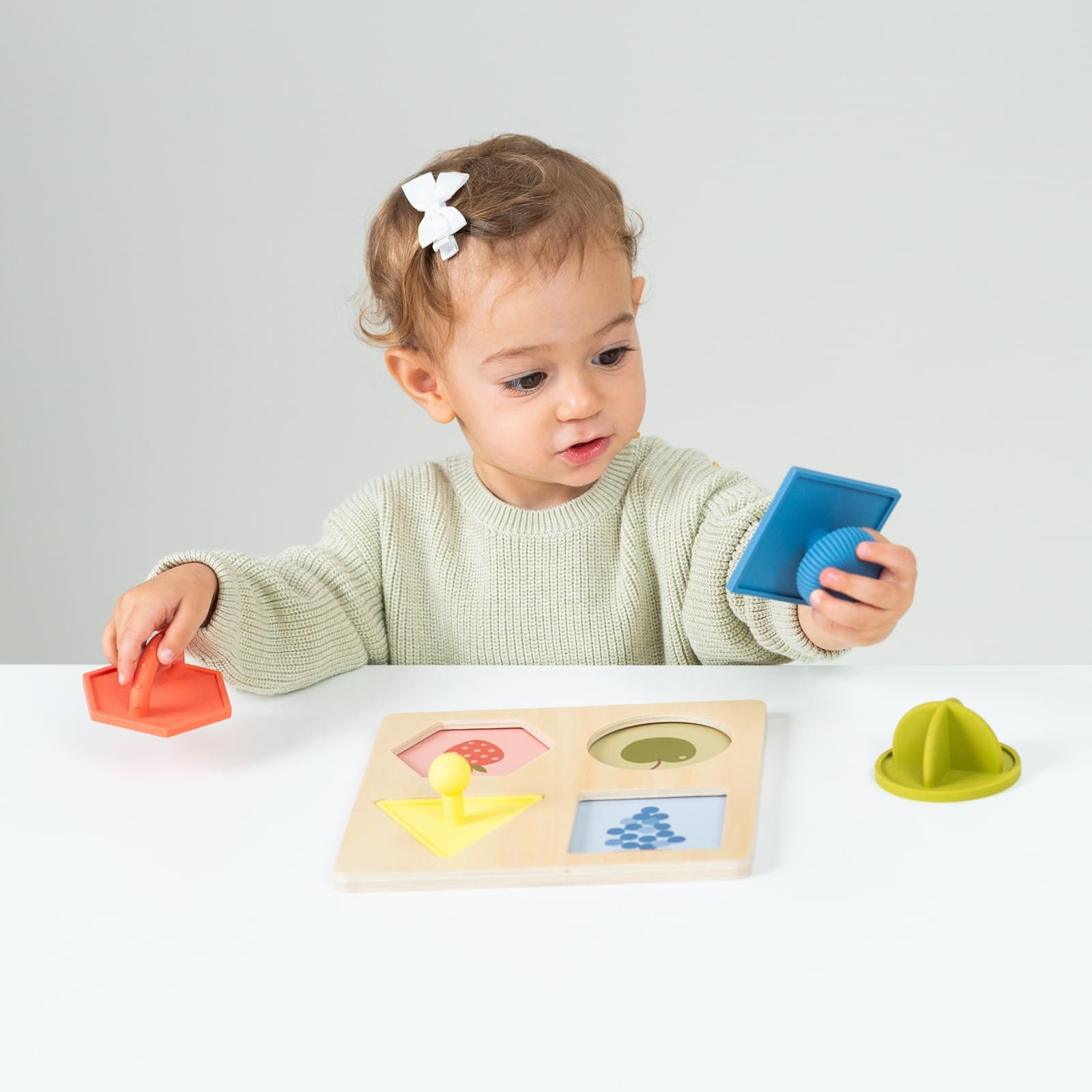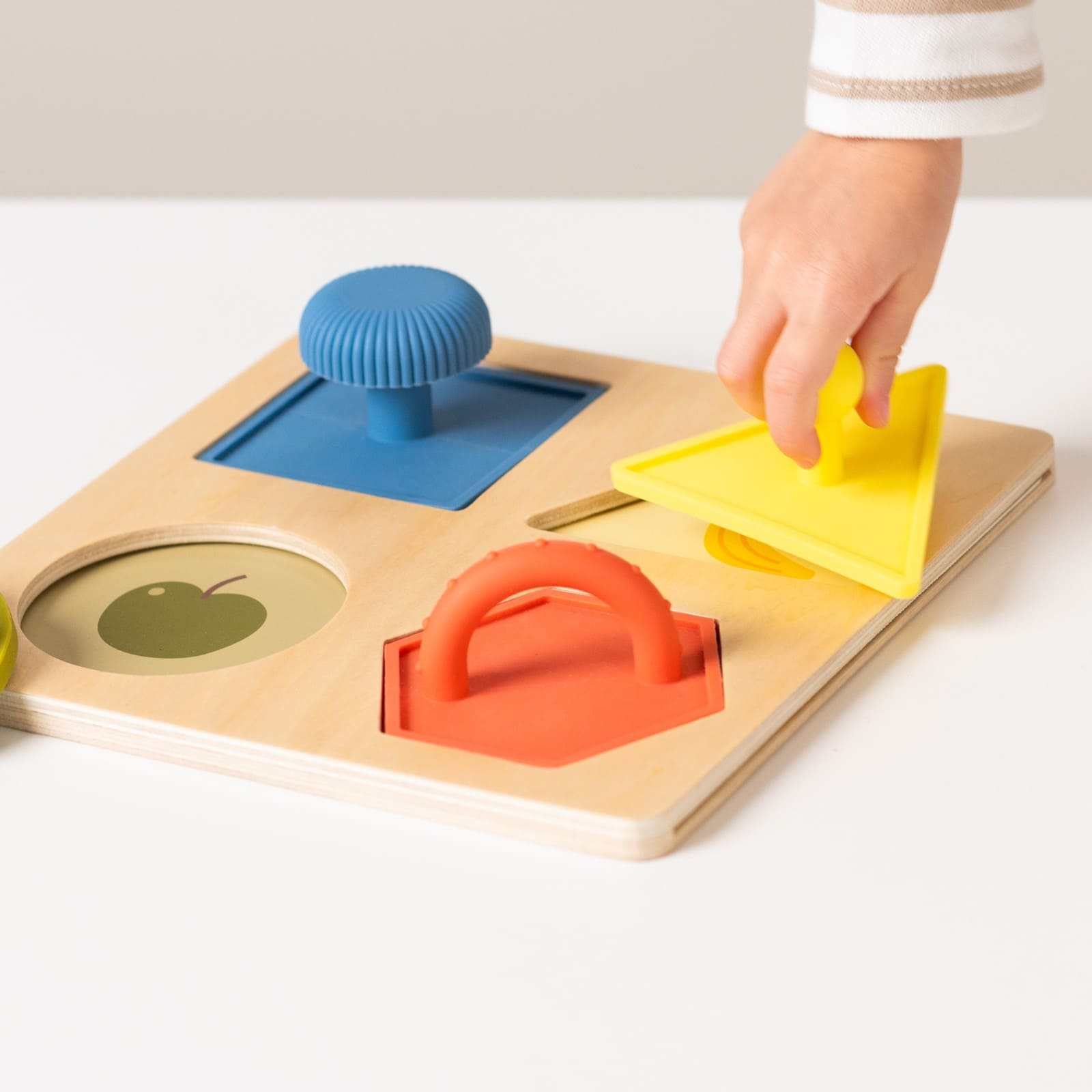Das Formenpuzzle kommt mit vier austauschbaren Themen: Tiere, Früchte, Farben und Zahlen. Jedes Set bietet verschiedene, leicht greifbare Silikonformen, die zum Einsetzen in die passende Aussparung einladen und so spielerisch neues Vokabular und Formen erforschen.