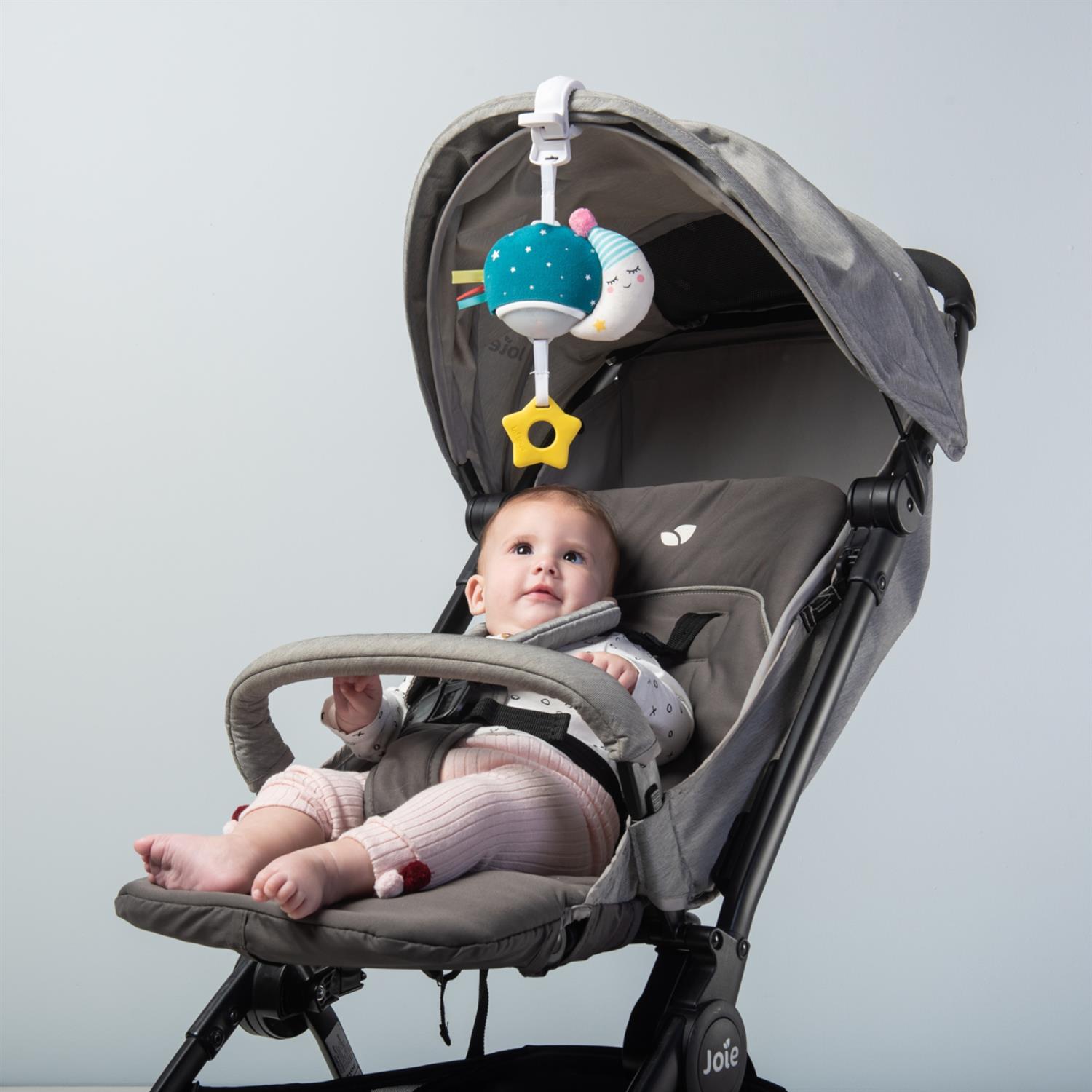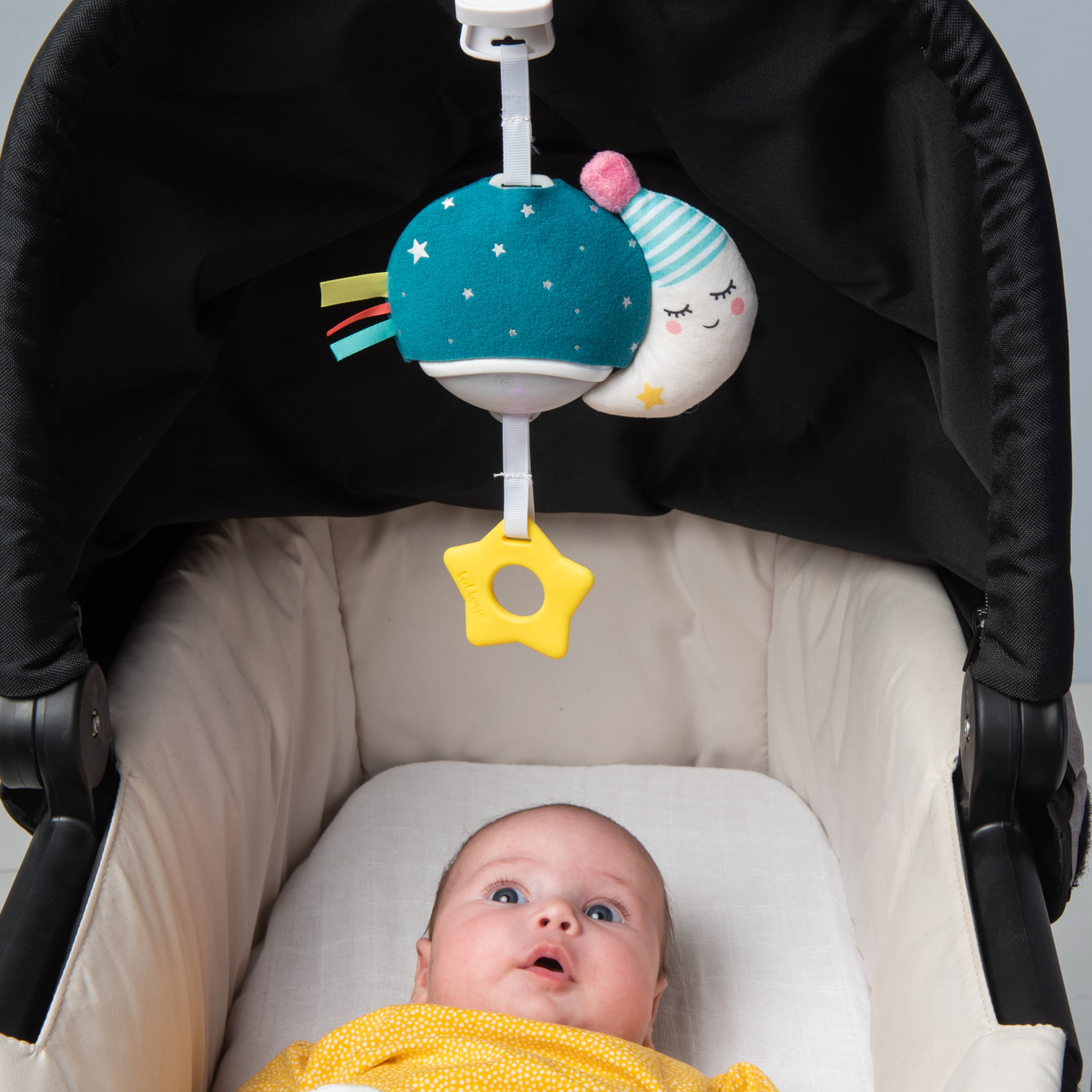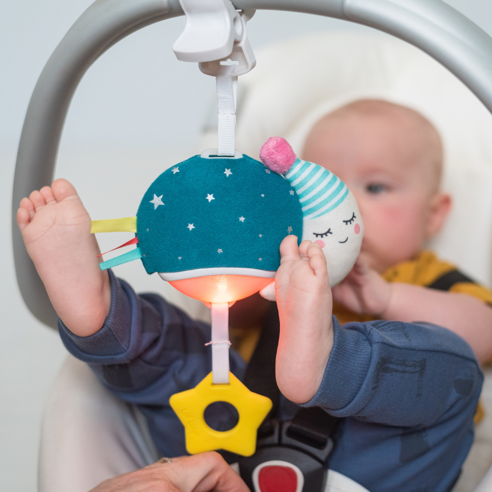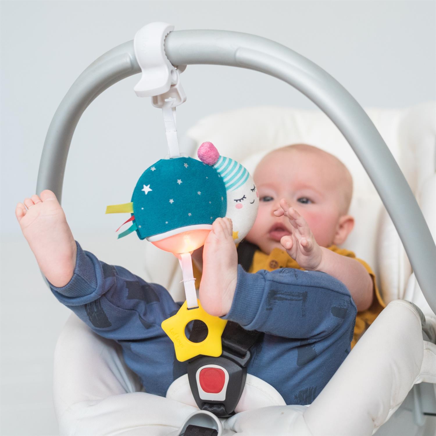 Ein grosser Plastikclip ermöglicht das einfache Befestigen an Kinderwagen, Babyschale oder Bettchen. So ist das Mini Moon jederzeit griffbereit und sorgt unterwegs für vertraute Geräusche und Ablenkung – ideal für Ausflüge, Autofahrten oder Besuche bei Freunden und Familie.