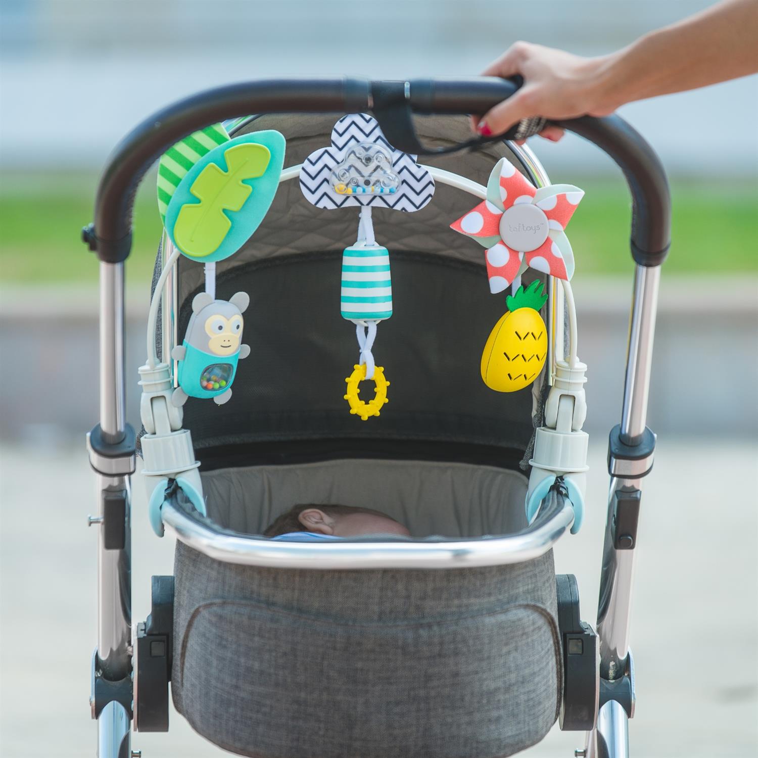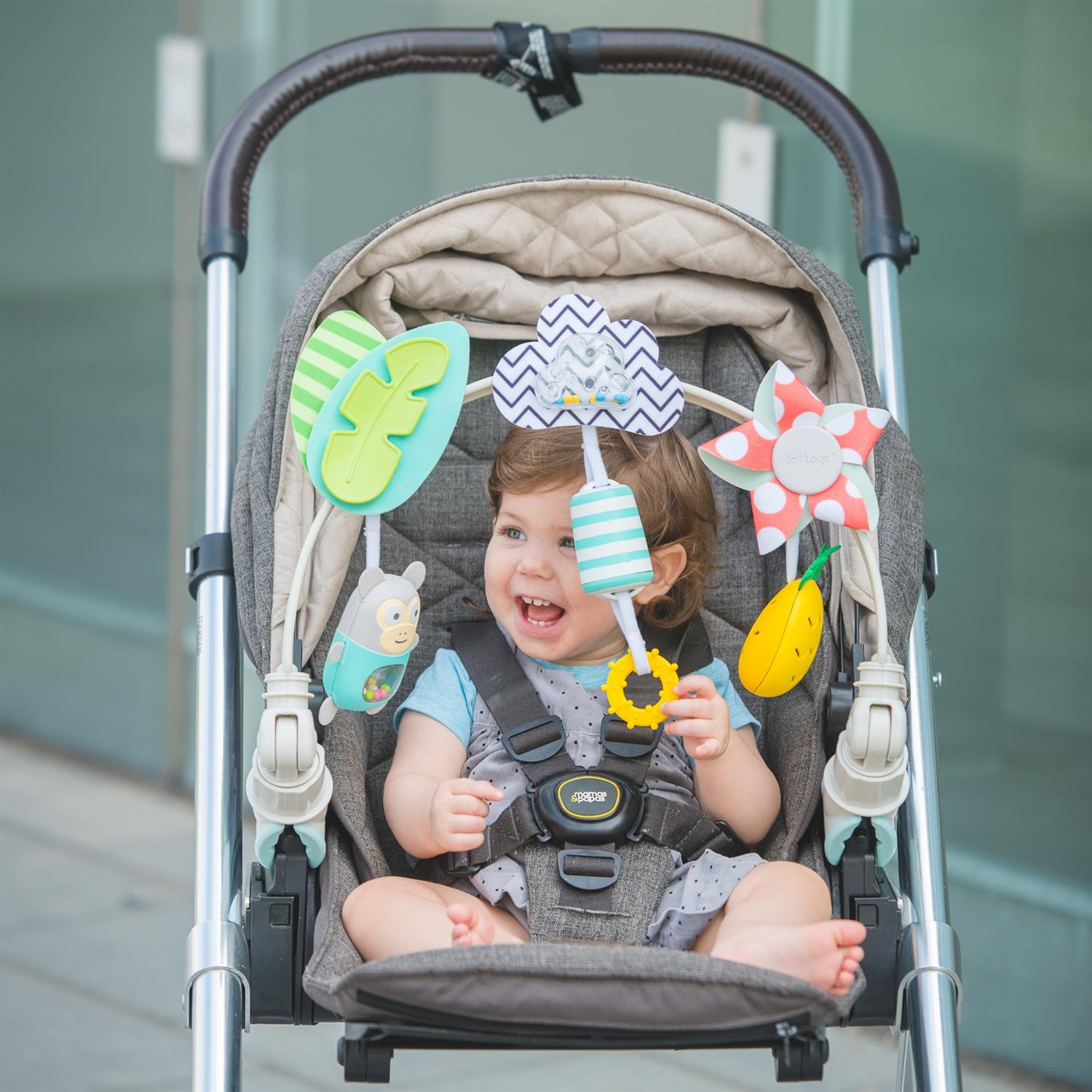 Der TAF-TOYS Spielbogen "Tropic" kombiniert ansprechende Formen, lebendige Farben und unterschiedliche Materialien zu einem abwechslungsreichen Spielerlebnis. An dem flexiblen Bogen hängen mehrere Spielzeuge, die zum Greifen, Fühlen und Entdecken einladen.