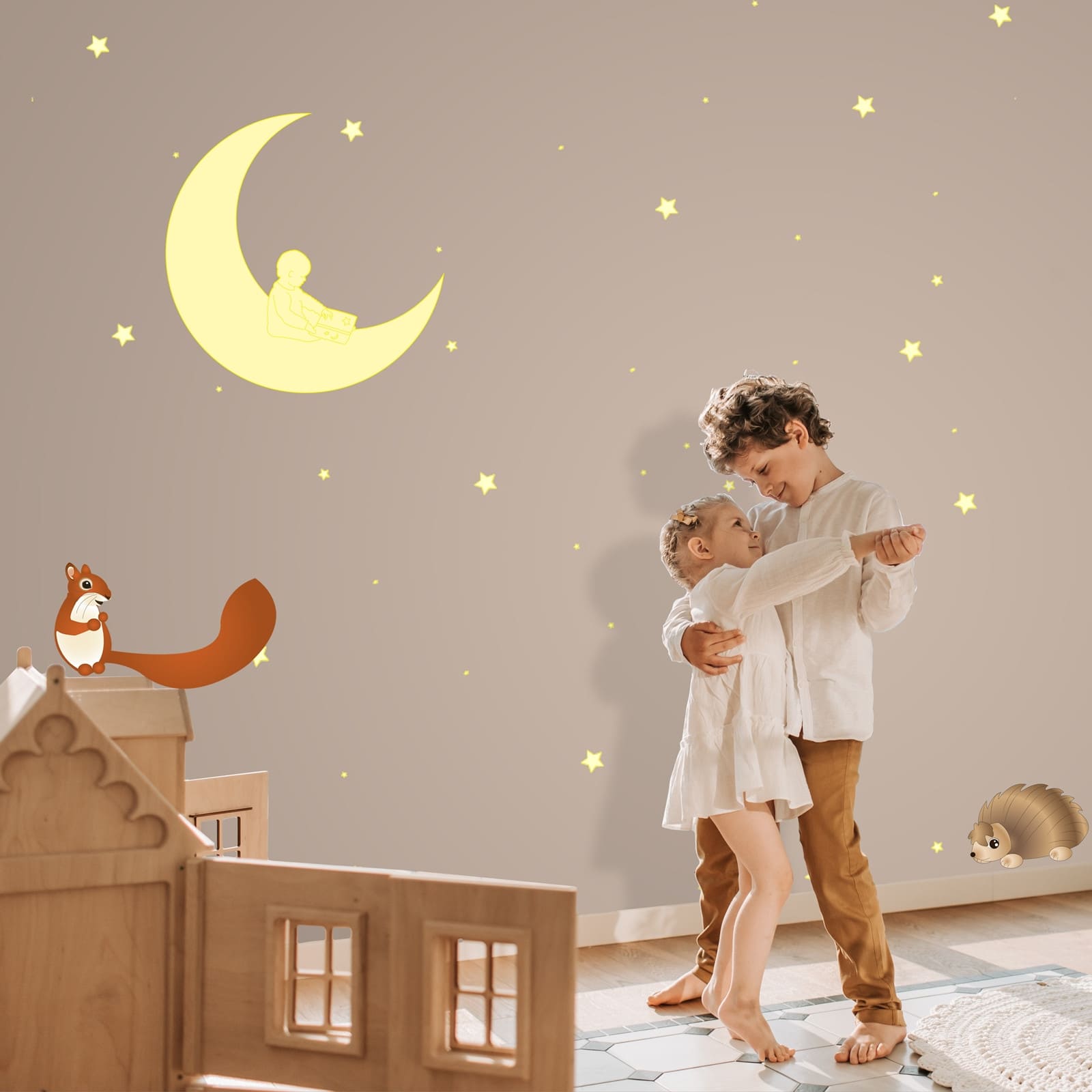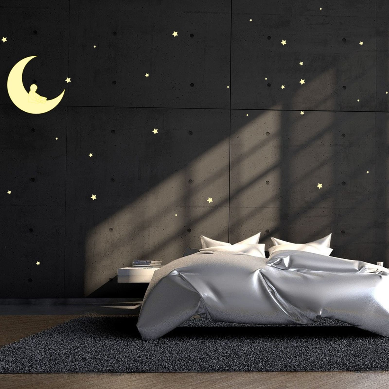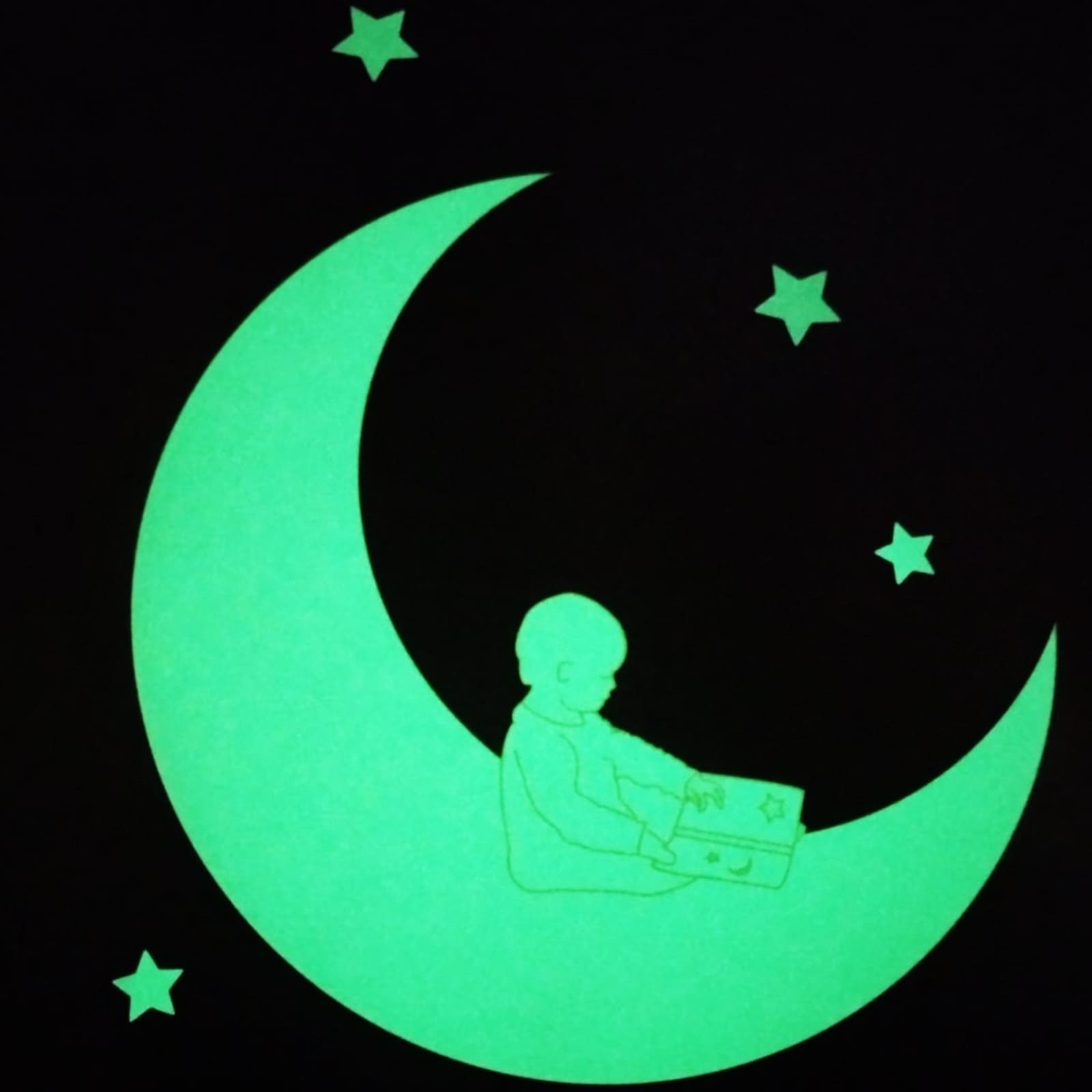 Die magnetischen Sterne in verschiedenen Groessen ergaenzen das Motiv und leuchten ebenfalls im Dunkeln, sodass das Zimmer zu einer kleinen, vertrauten Traumwelt wird, die Kindern beim Einschlafen hilft.