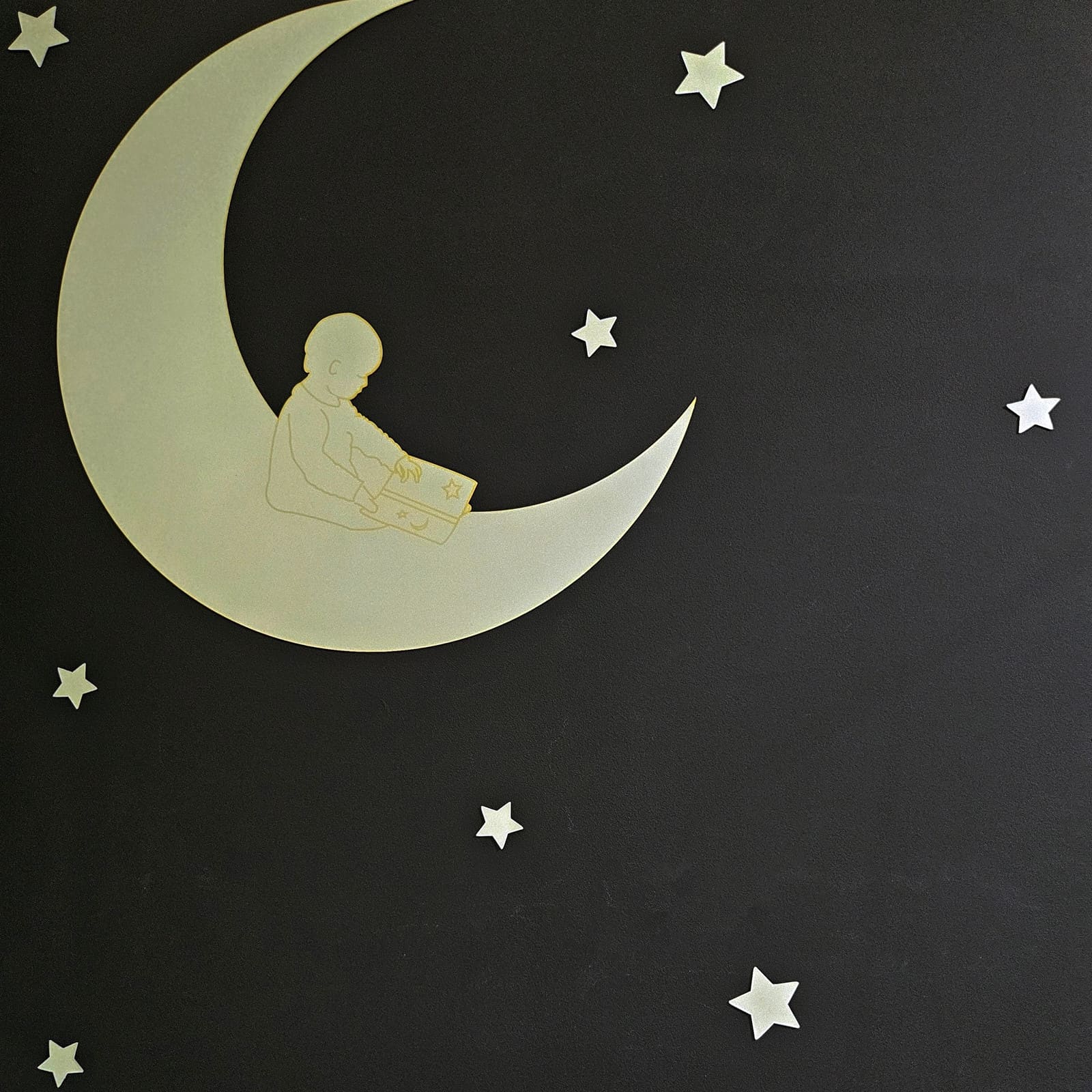 Im Mittelpunkt steht der leuchtende Mond mit einem liebevoll gestalteten Motiv, auf dem ein Kind auf dem Mond sitzt und liest. Wenn das Licht ausgeht, strahlt der Mond sanft weiter und schafft eine wohlige, beruhigende Atmosphaere.