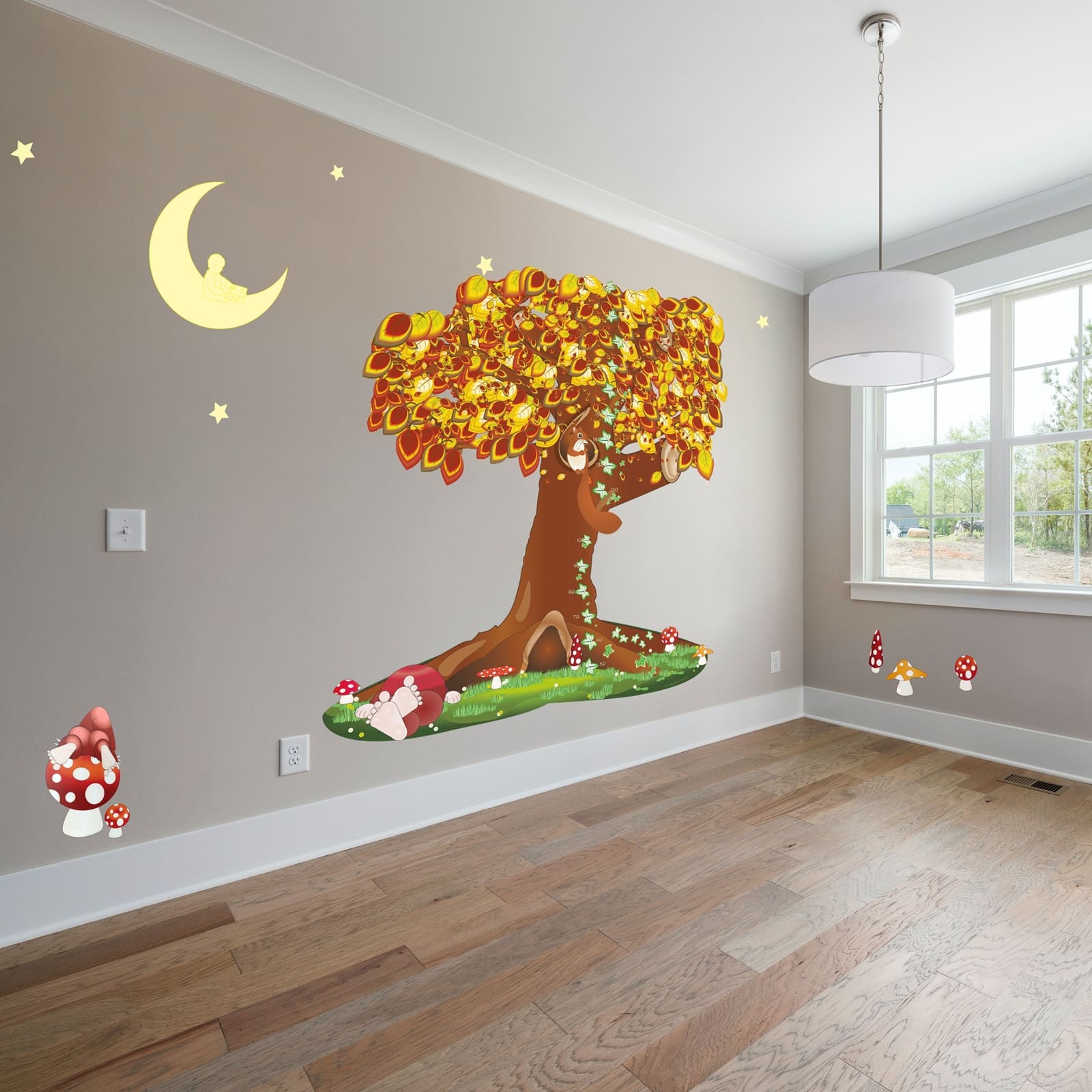 So kannst du das Kinderzimmer spielerisch anpassen: Tagsueber frische Farben, abends eine beruhigende Szene – die Elemente sind wiederverwendbar und schonen die Wandoberflaeche.