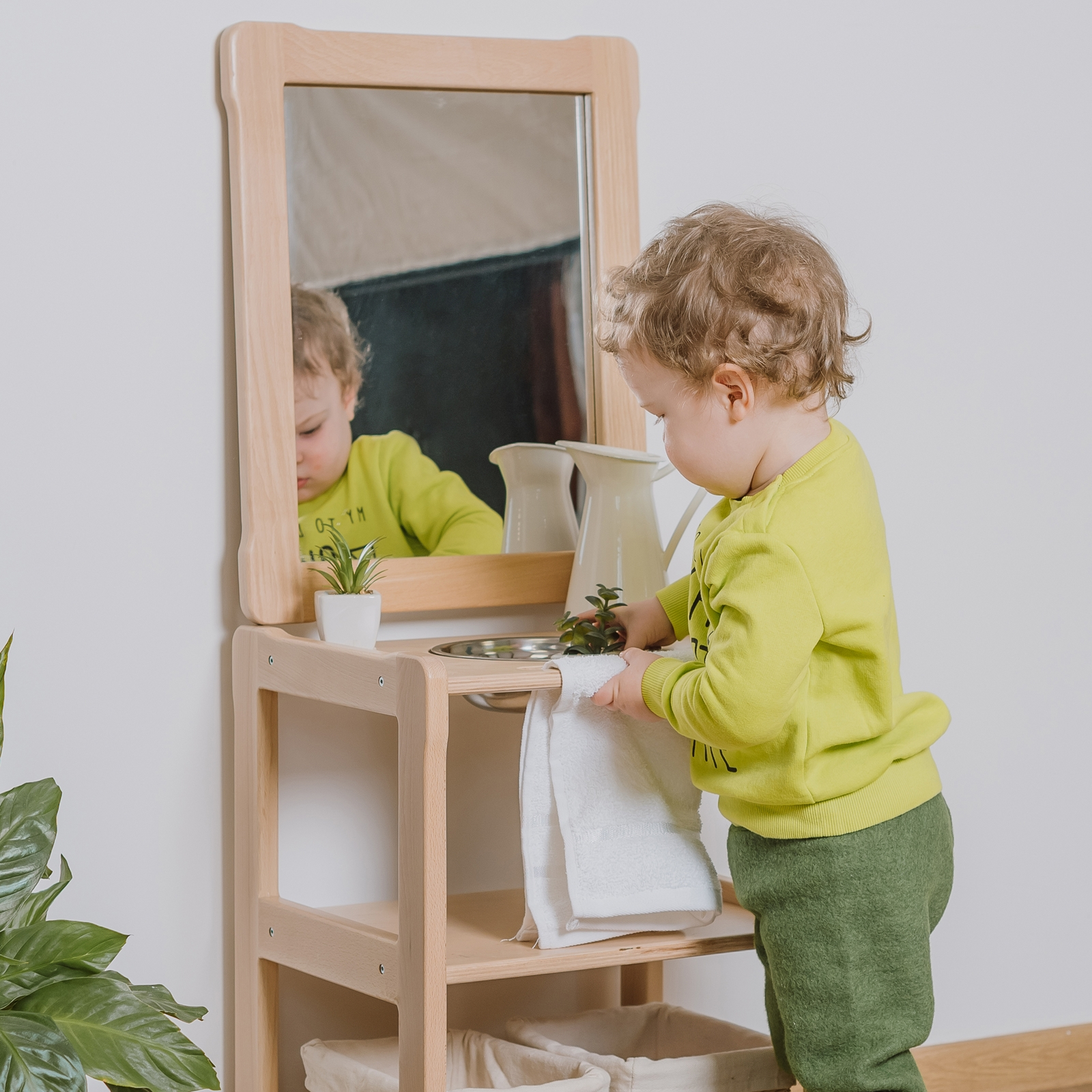 Mit dem Waschbecken lernt dein Kind Verantwortung für die eigene Hygiene zu übernehmen. Das Beobachten im Spiegel stärkt die Selbstwahrnehmung und unterstützt gleichzeitig motorische und kognitive Entwicklungsprozesse. Kleine Erfolgserlebnisse bei der Körperpflege fördern langfristig die Unabhängigkeit.