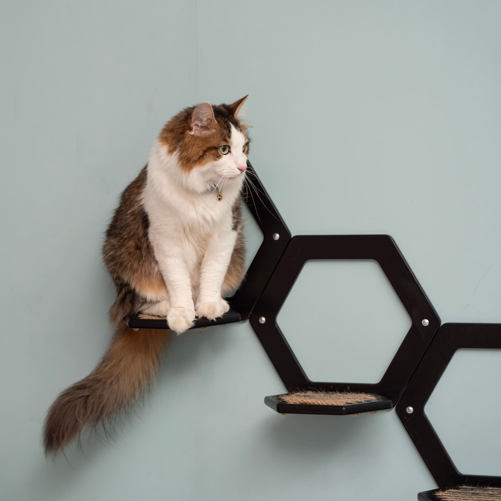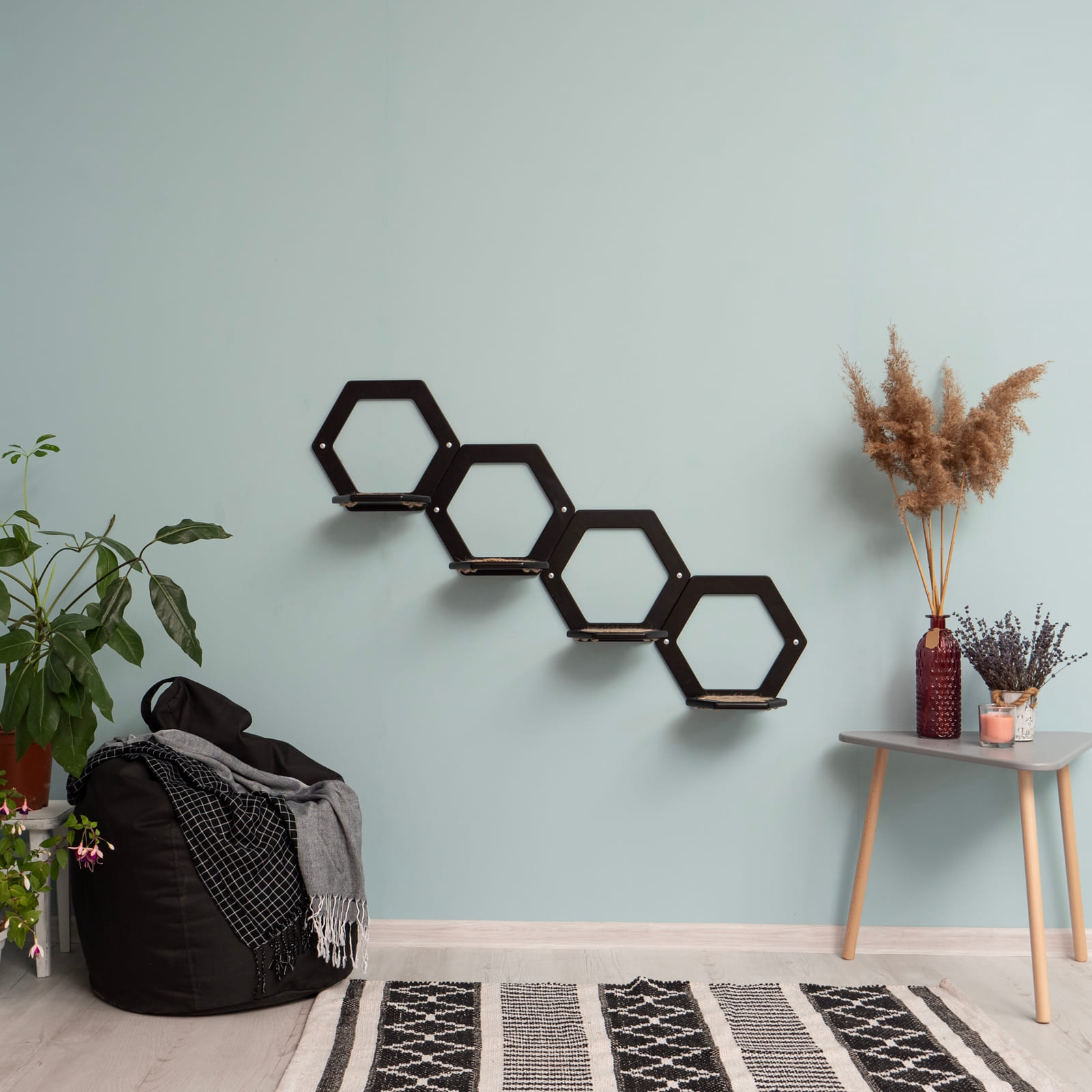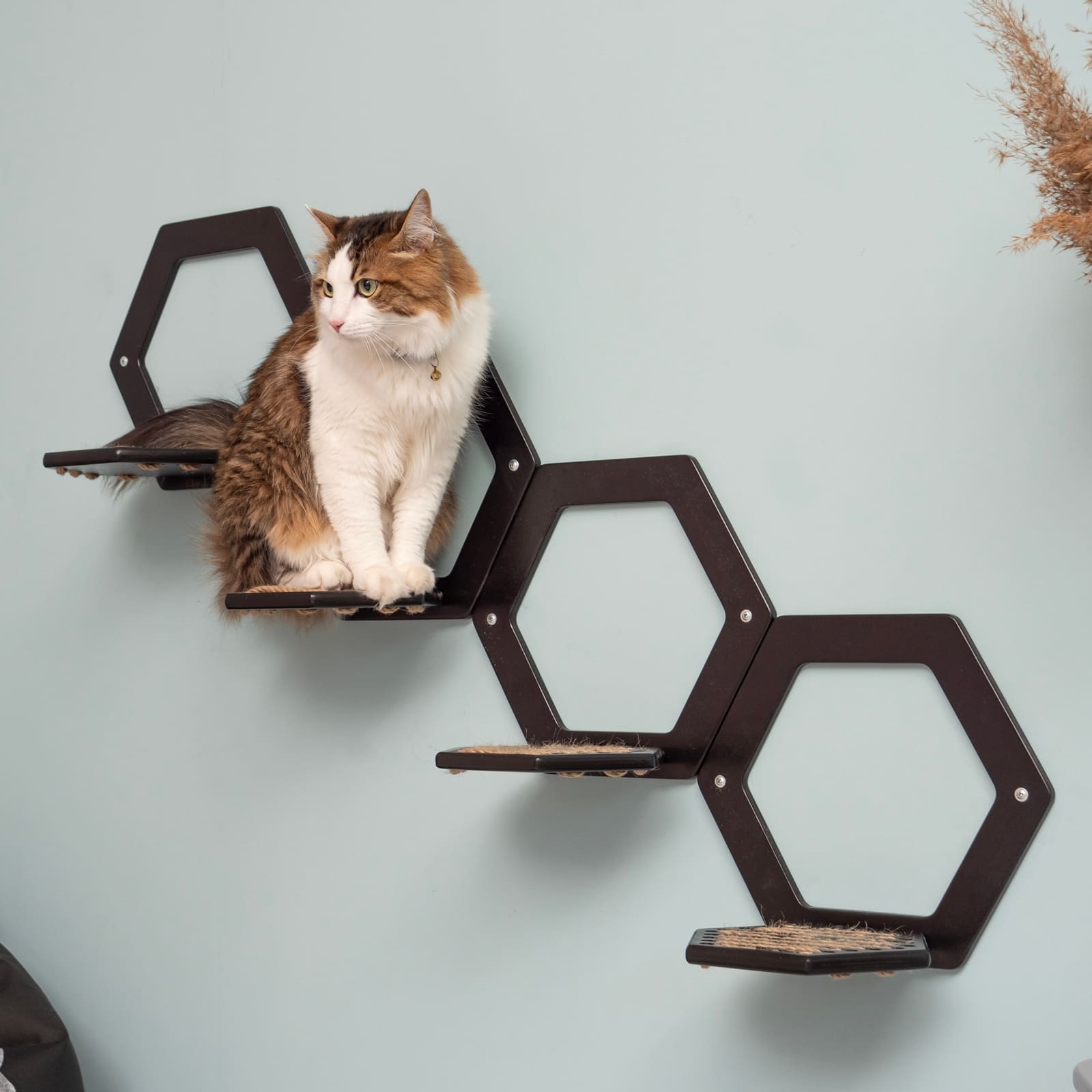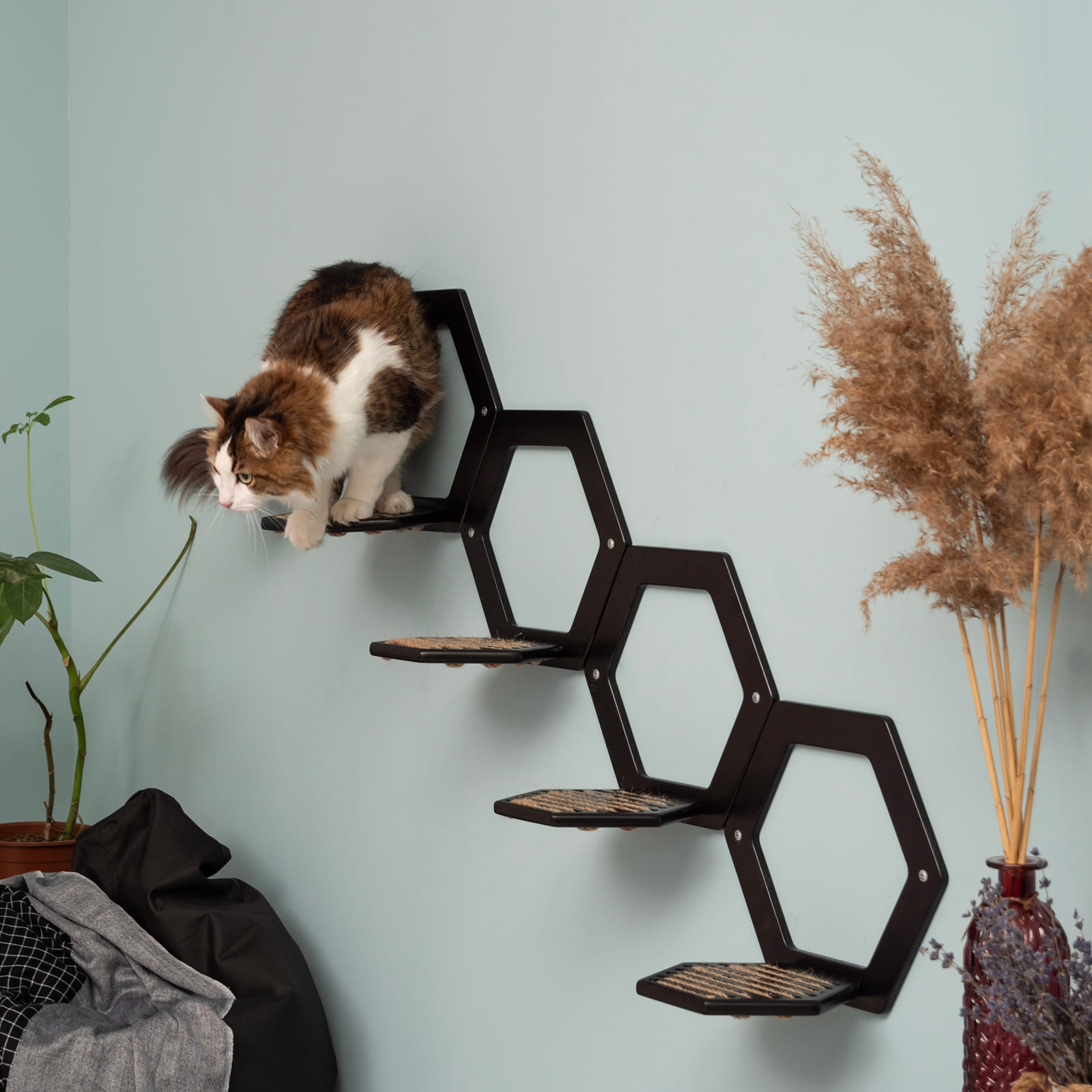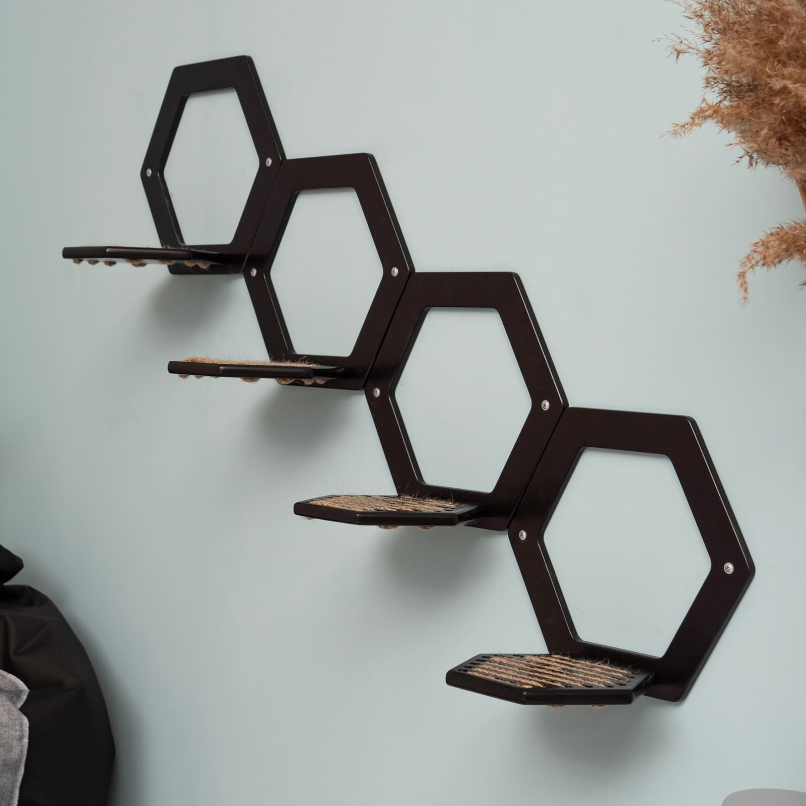 Das elegante Schwarz und die sechseckige Form fügen sich harmonisch in moderne Inneneinrichtungen ein und setzen zugleich einen dezenten Blickfang an der Wand. Durch das durchdachte Design wirken die Stufen auch dann stilvoll, wenn sie nicht von deinem Tier genutzt werden.
