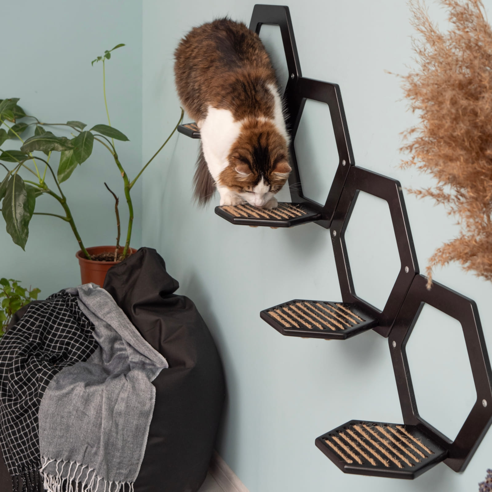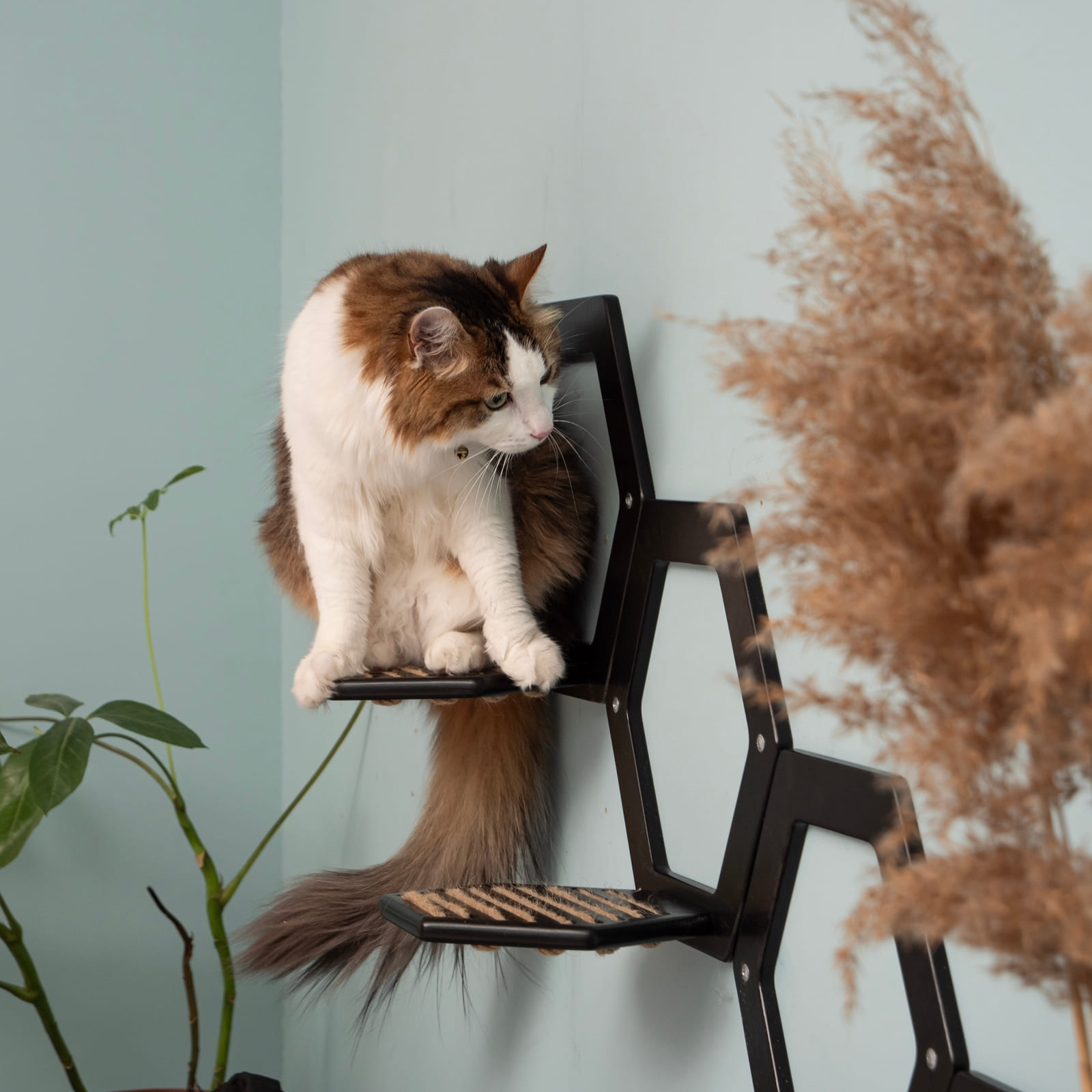 Neben ihrer Funktion als Kletterlandschaft eignen sich die Stufen auch als dekorative Ablage für Pflanzen, kleine Bücher oder persönliche Accessoires und bereichern damit deine Wohnatmosphäre. So verbindet das System Nutzen für Haustier und Mensch.