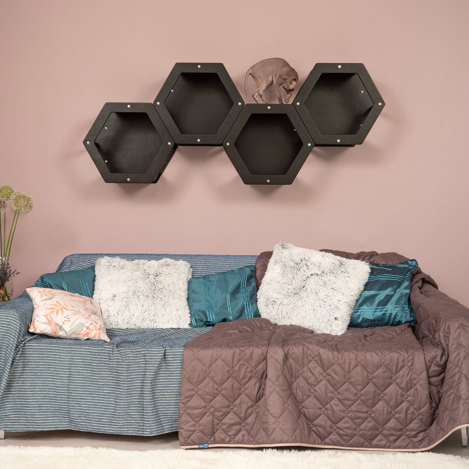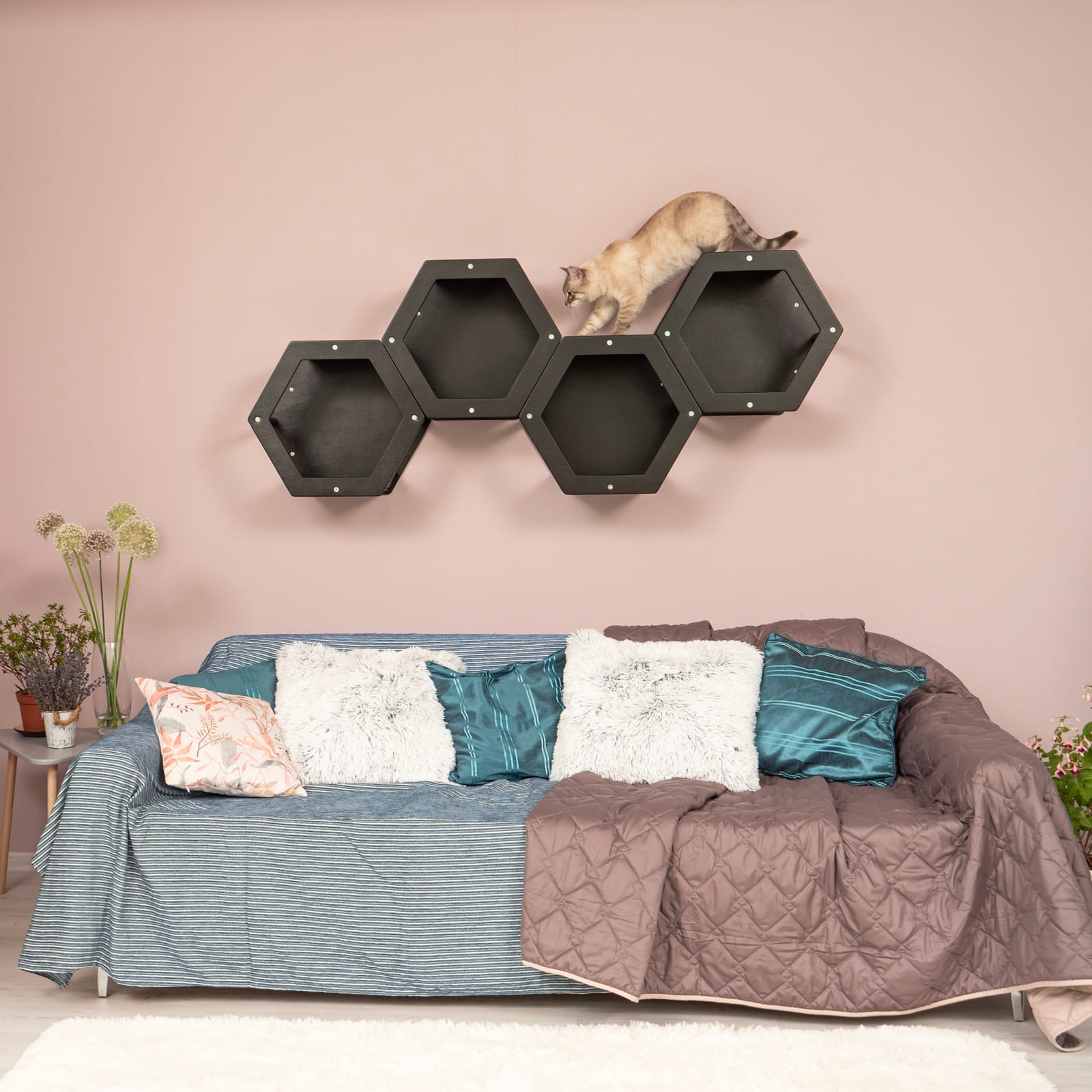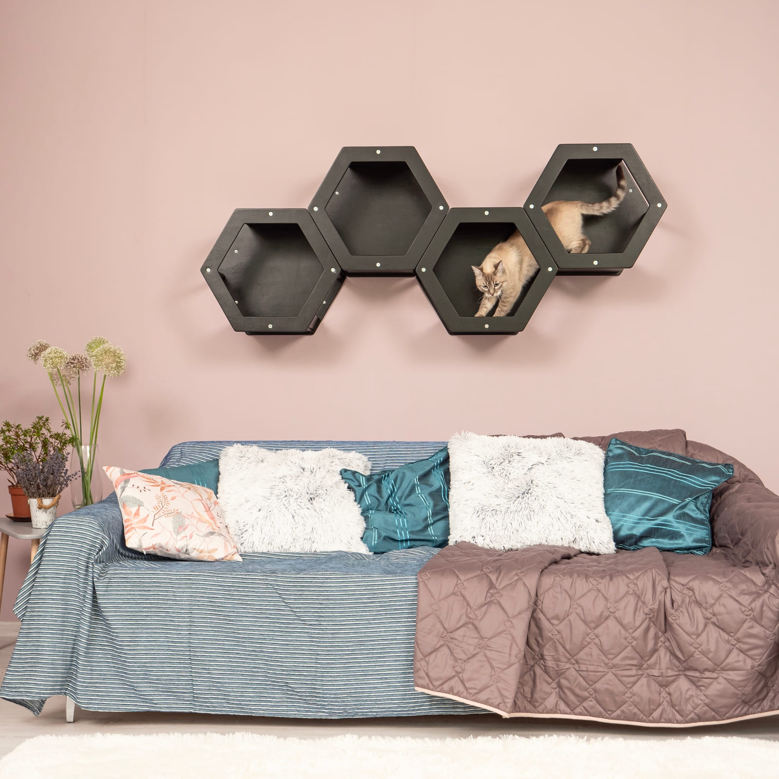 WOWHELPERCO 4 Waben schwarz – Katzenregal aus Naturholz für stilbewusste Haushalte