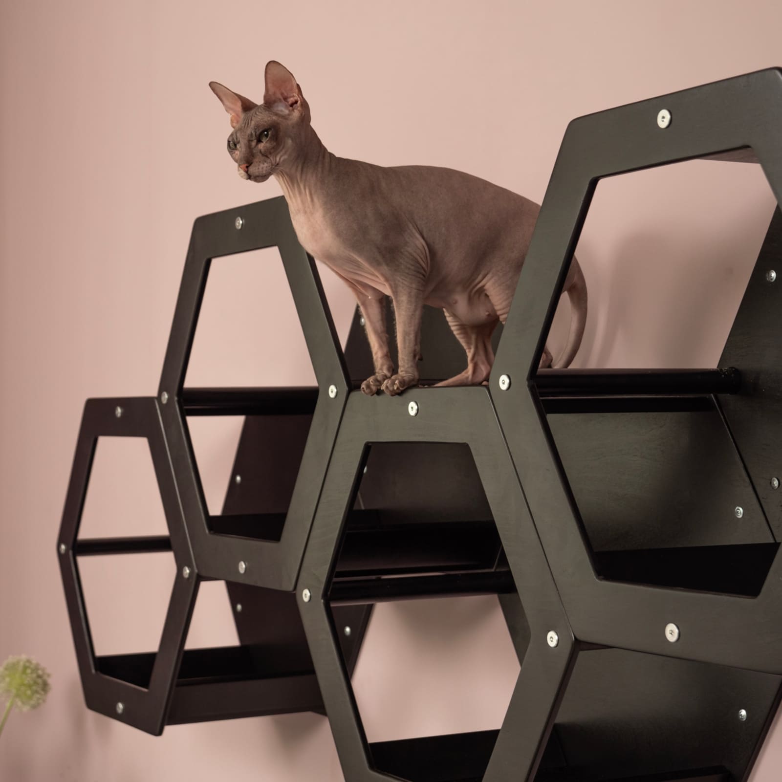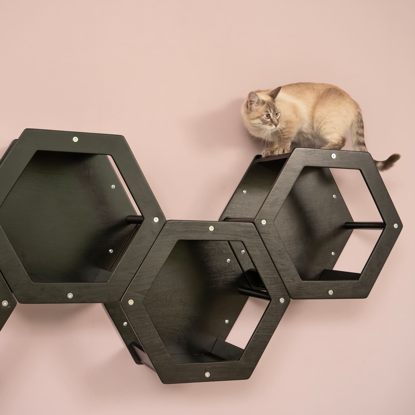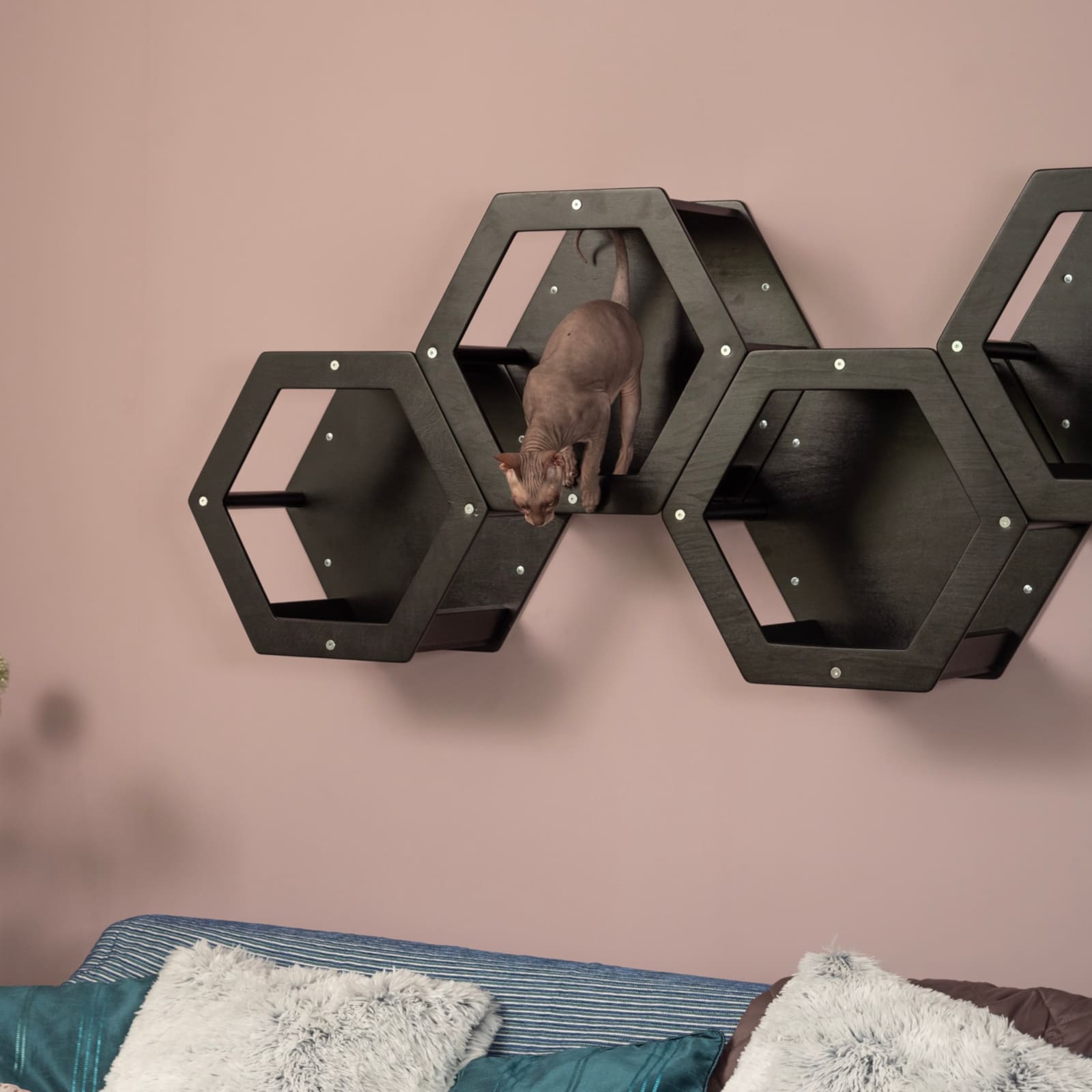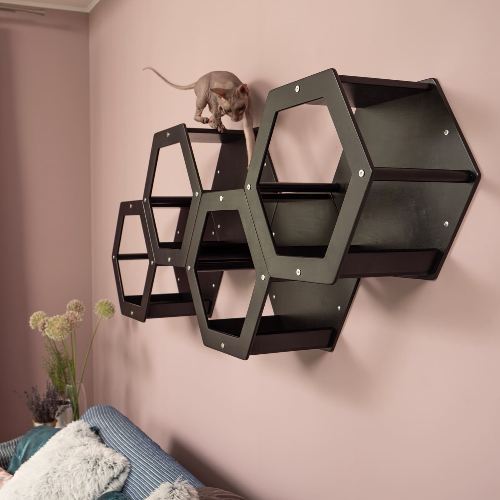 WOWHELPERCO 4 Waben schwarz – Katzenregal aus Naturholz für stilbewusste Haushalte