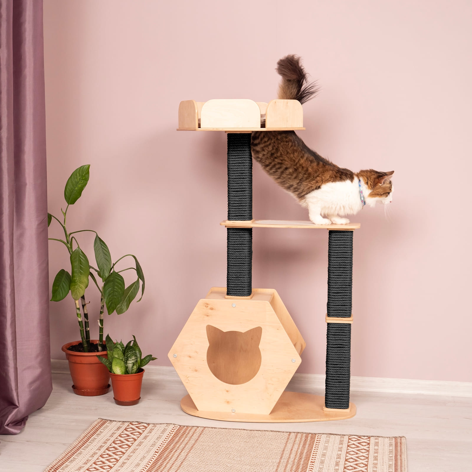 Dank der besonderen Sechseckform lässt sich der Kratzbaum flexibel in verschiedene Raumsituationen integrieren. Er harmoniert sowohl mit modernen als auch mit klassischen Einrichtungen und verleiht dem Raum eine natürliche Note.