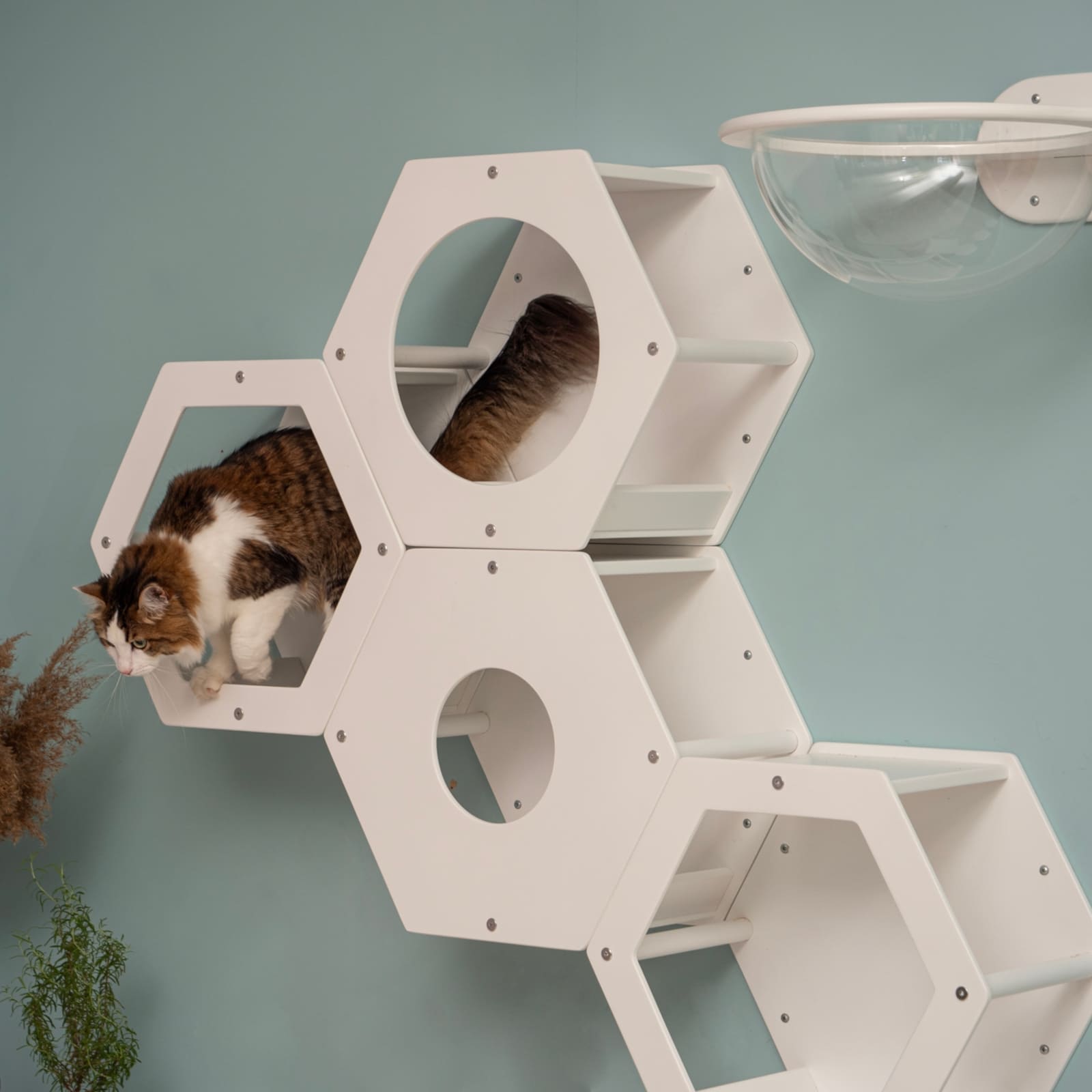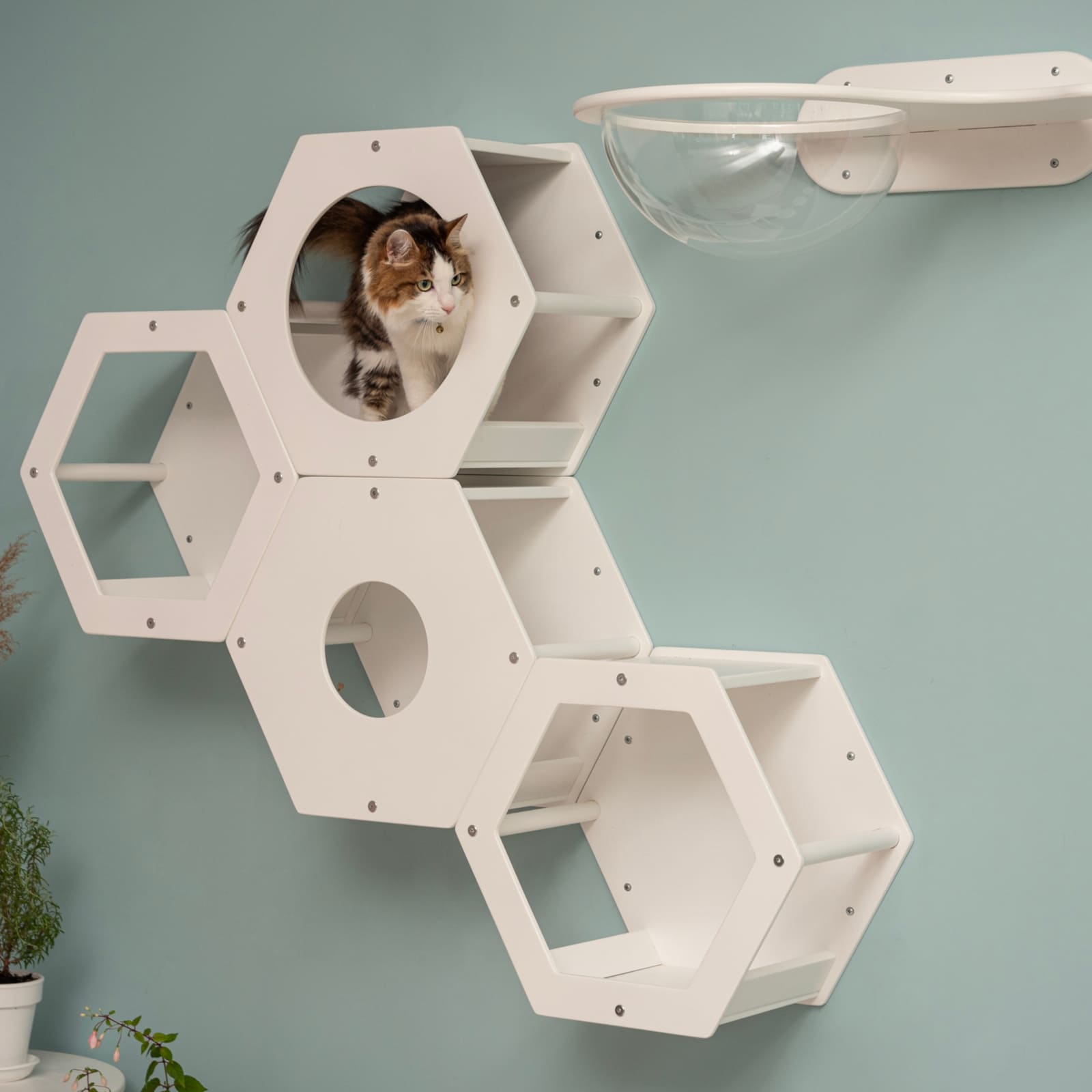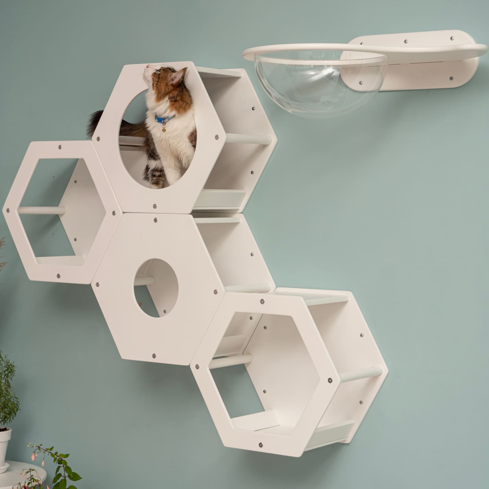 Besonders das Hexagon-Modul mit integriertem Acrylfenster und grosser Öffnung schafft einen geschützten Rückzugsort, in dem deine Katze die Umgebung beobachten kann, ohne gestört zu werden. So werden Spieltrieb und Wohlbefinden gleichermaassen gefördert.