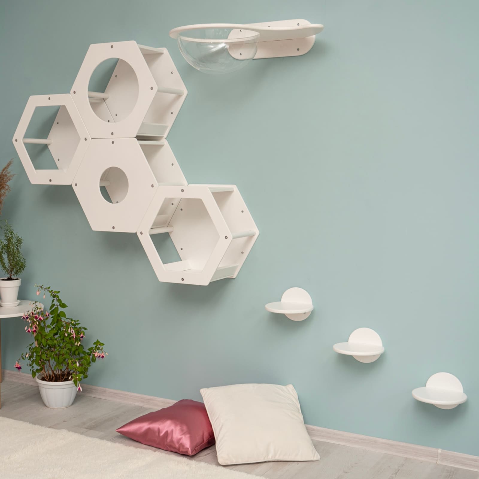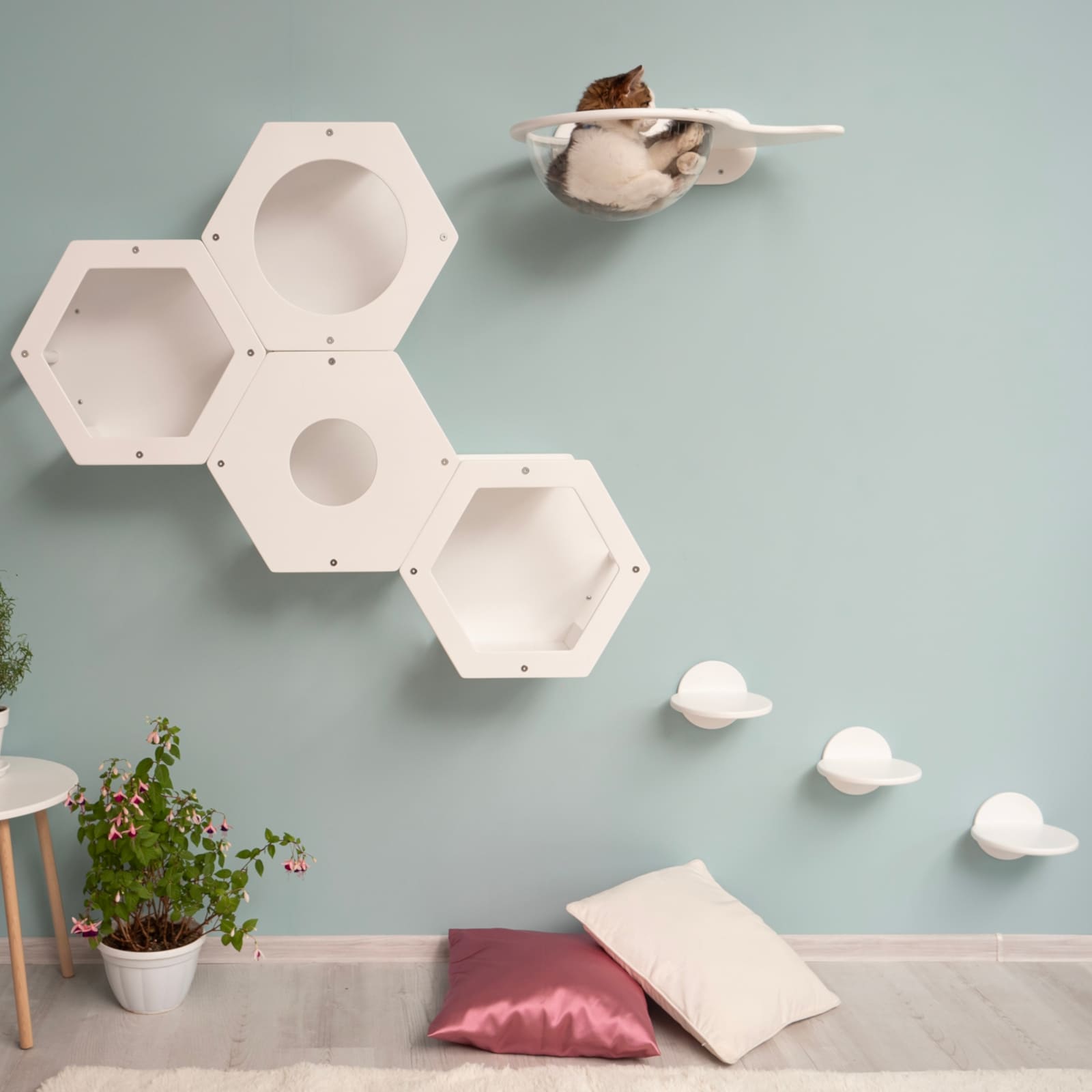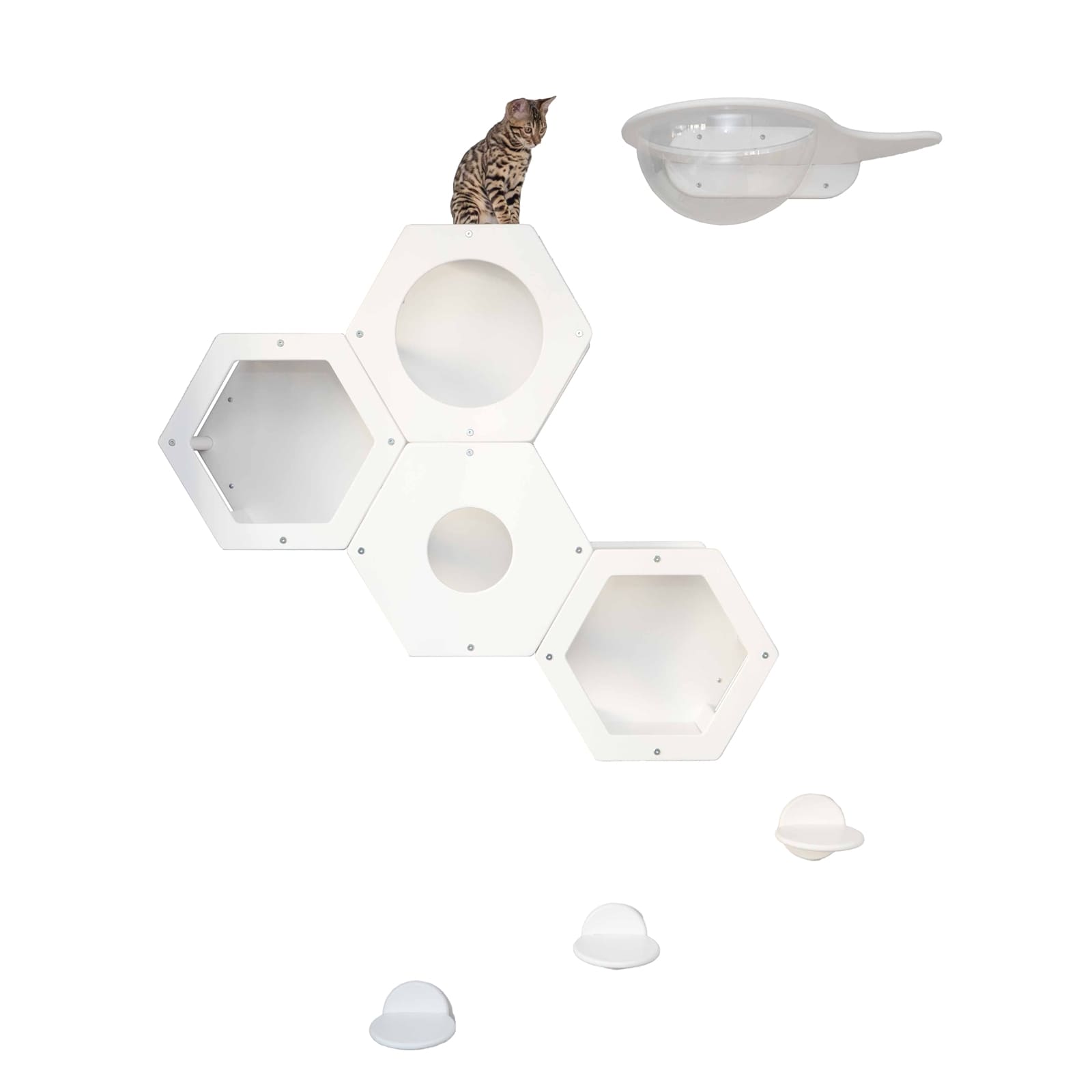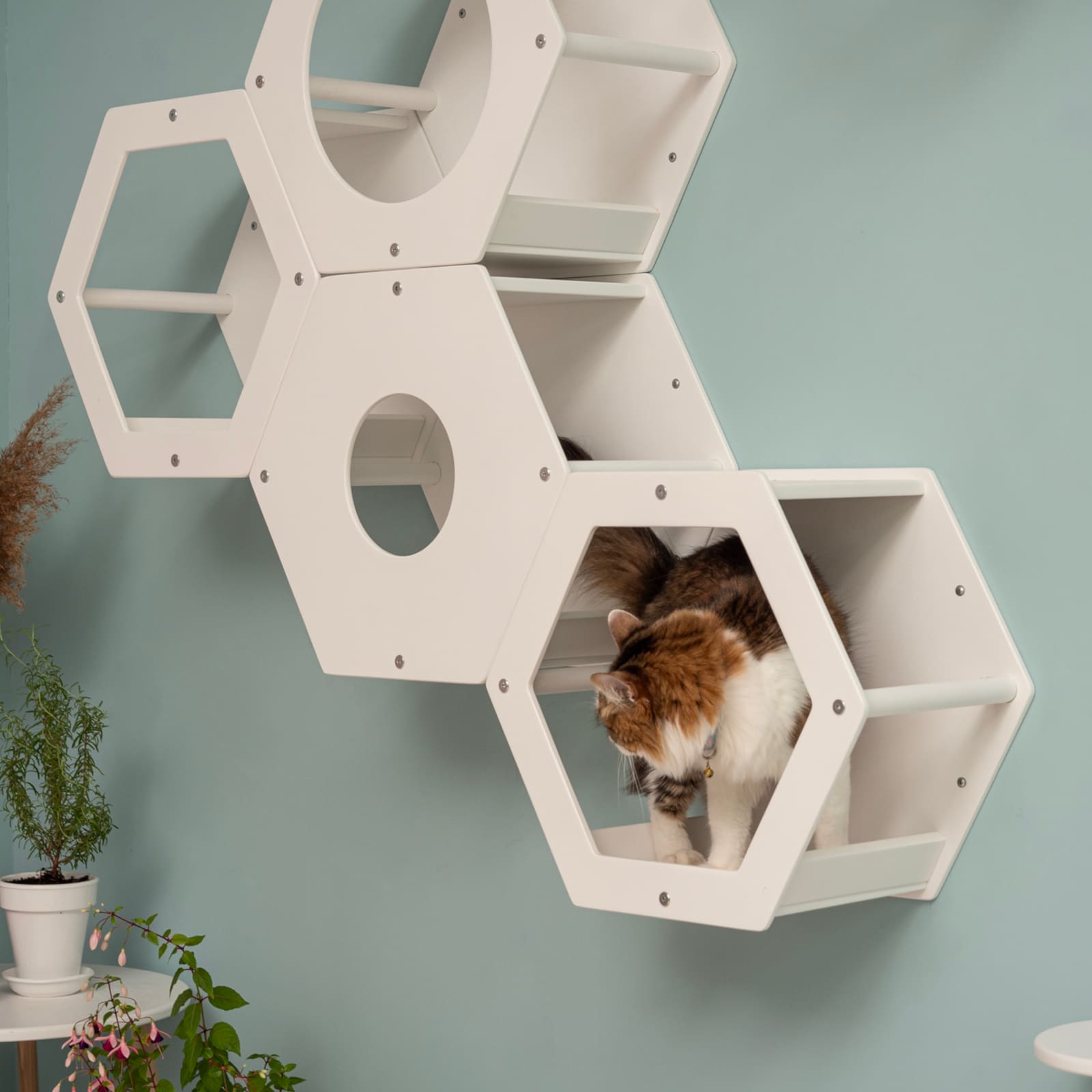 Besonders das Hexagon-Modul mit integriertem Acrylfenster und grosser Öffnung schafft einen geschützten Rückzugsort, in dem deine Katze die Umgebung beobachten kann, ohne gestört zu werden. So werden Spieltrieb und Wohlbefinden gleichermaassen gefördert.