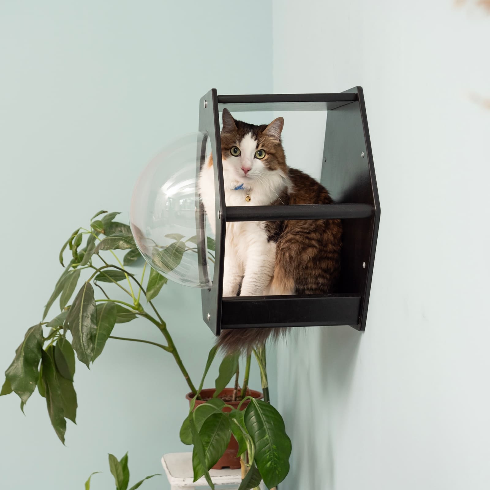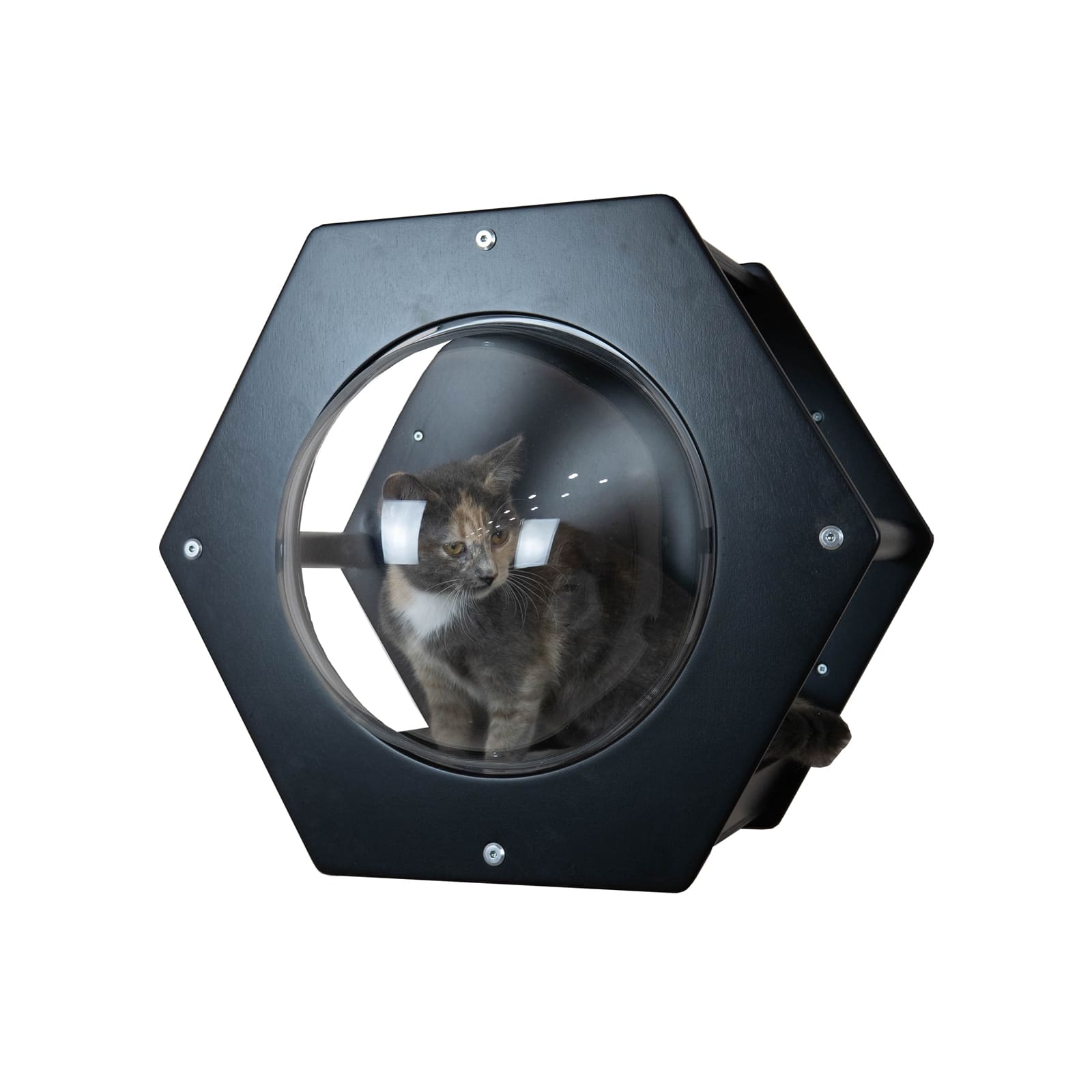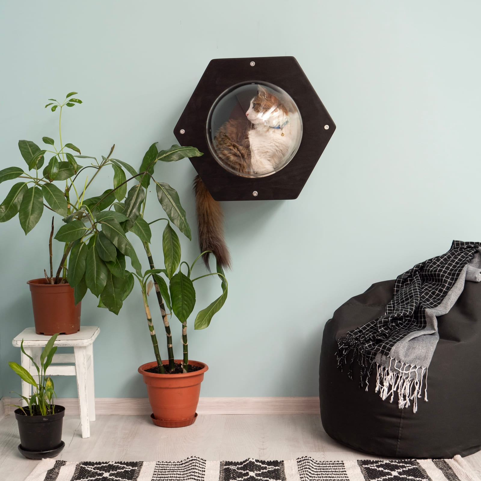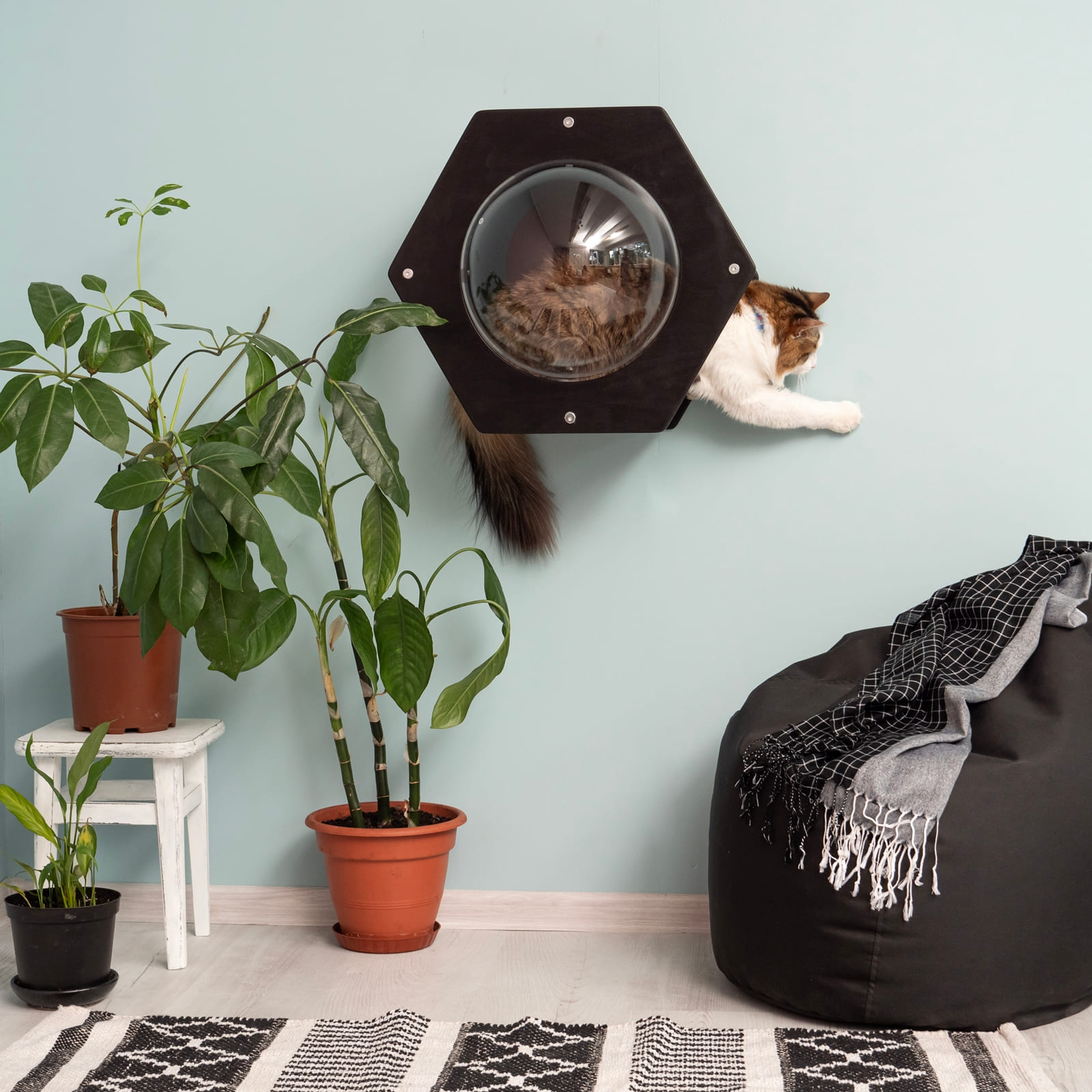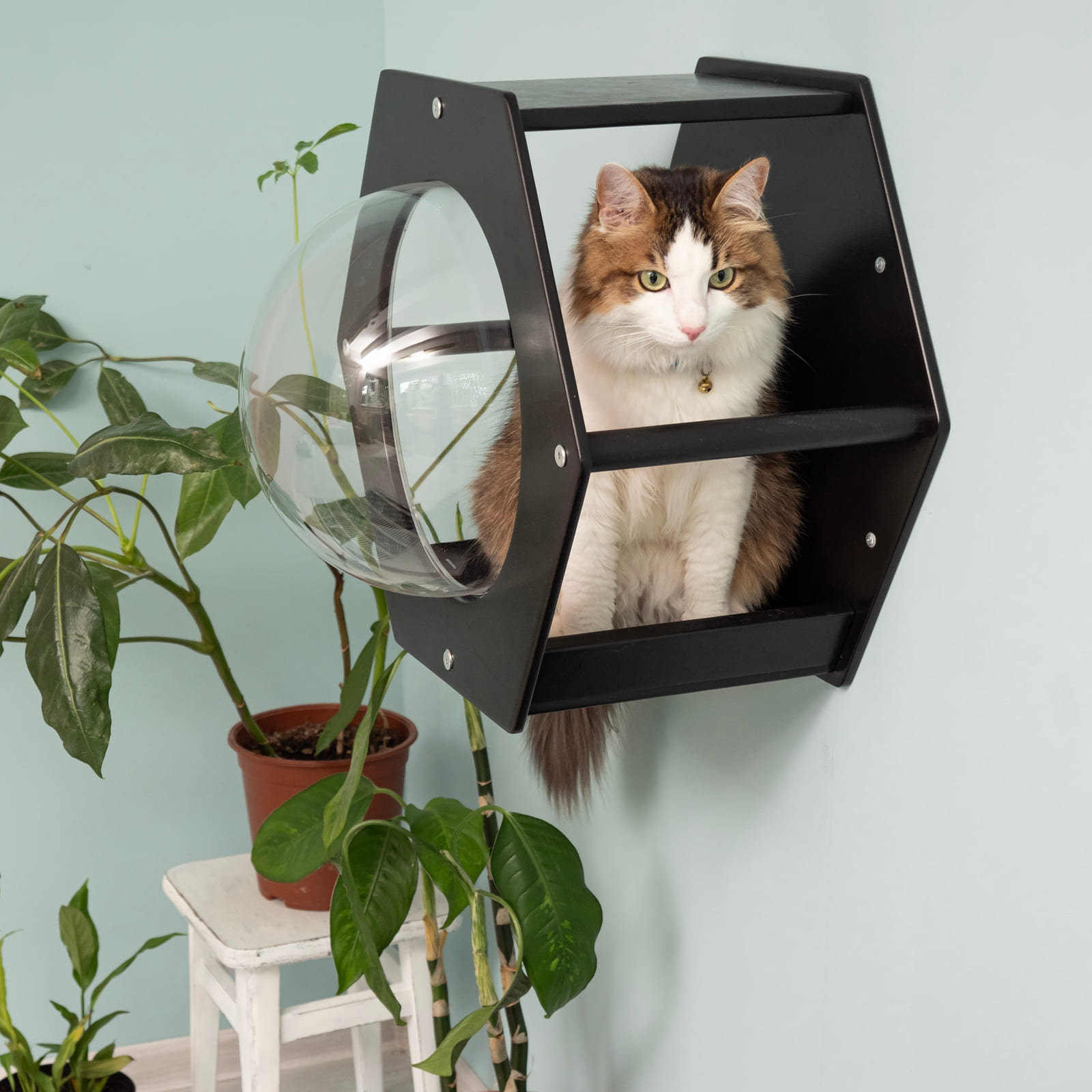 WOWHELPERCO Sechseck mit Acrylfenster schwarz – Katzennest wandmontiert