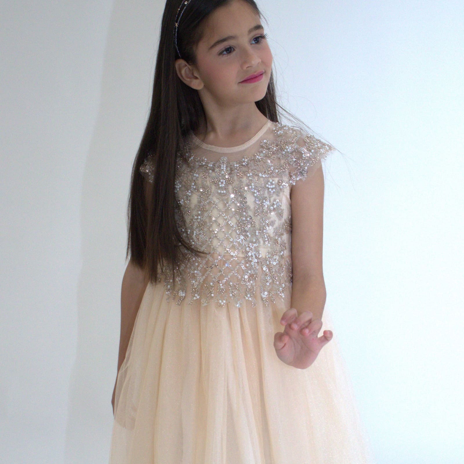 Mit diesem Kleid triffst du eine stilvolle Wahl, die Komfort und Ästhetik vereint — ideal für kleine Prinzessinnen, die an besonderen Tagen glänzen sollen.