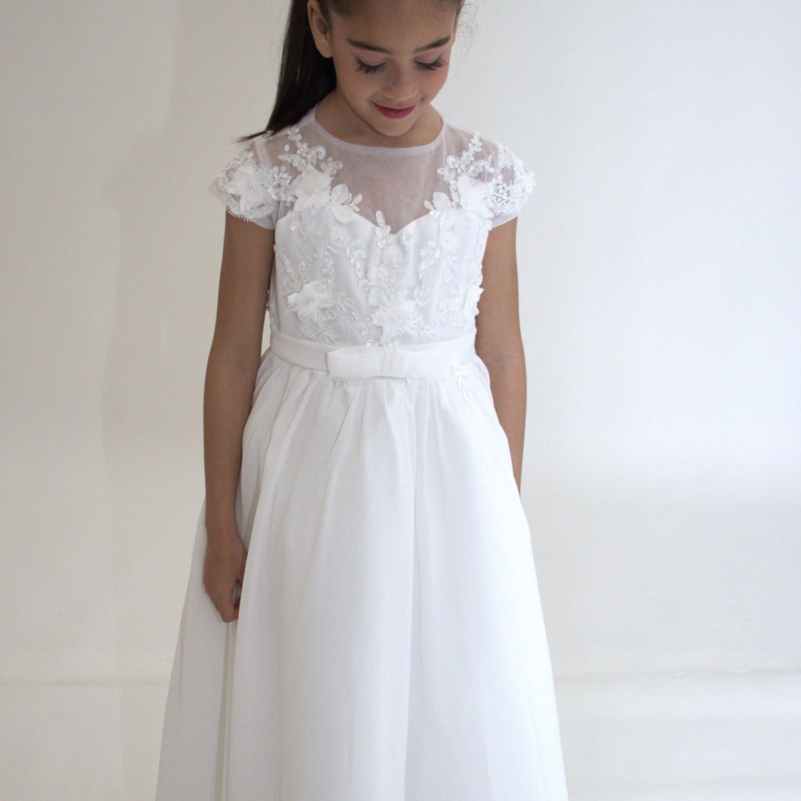Jeanne kombiniert klassische Prinzessinnen-Elemente mit einer modernen, schlichten Silhouette. Der Schnitt betont die Anmut und bleibt dabei altersgerecht und unaufdringlich.